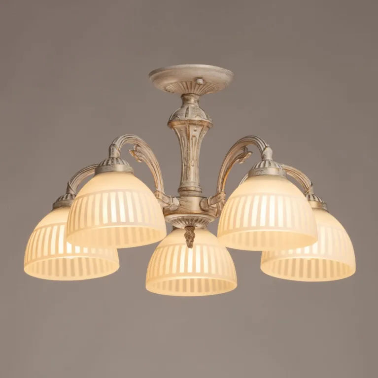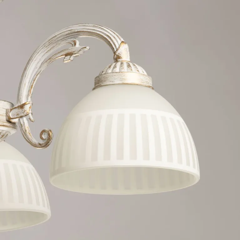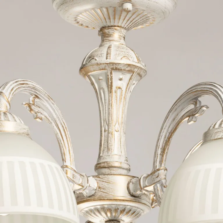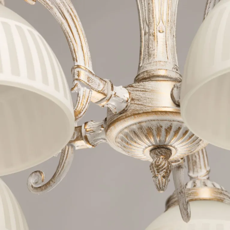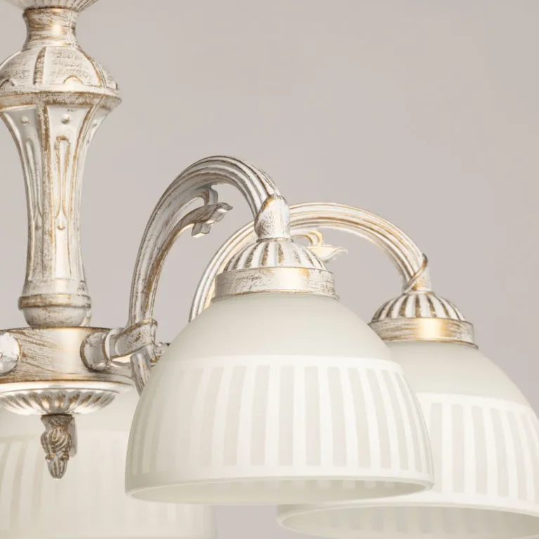 Преобладающий цвет плафонов: Белый, арматуры: Бежевый; материал изготовления арматуры: Металл, размеры, мм: / высота 300 / диаметр 530. Общая мощность – 300 Ватт, а максимальная площадь освещения до 15 м2. Основной тип ламп, предусмотренный производителем: Накаливания с цоколем E27. В зависимости от предпочтений можно использовать лампы теплового, холодного или нейтрального света, за исключением люстр с типом цоколя LED.