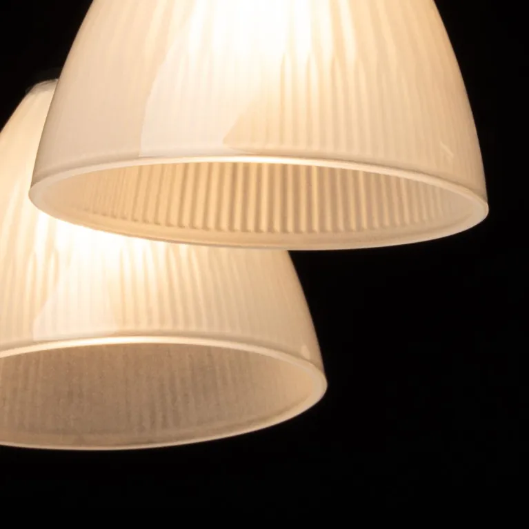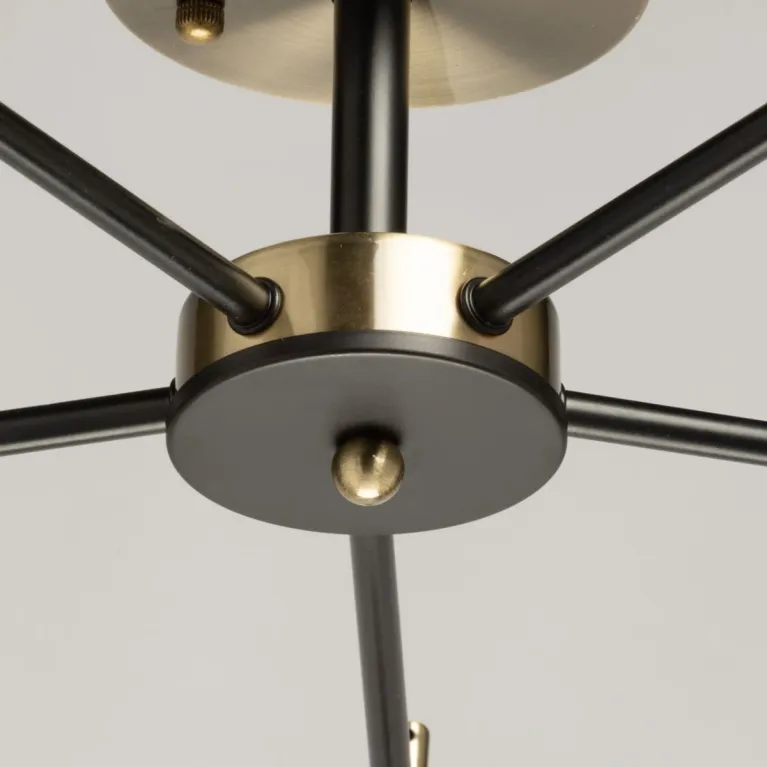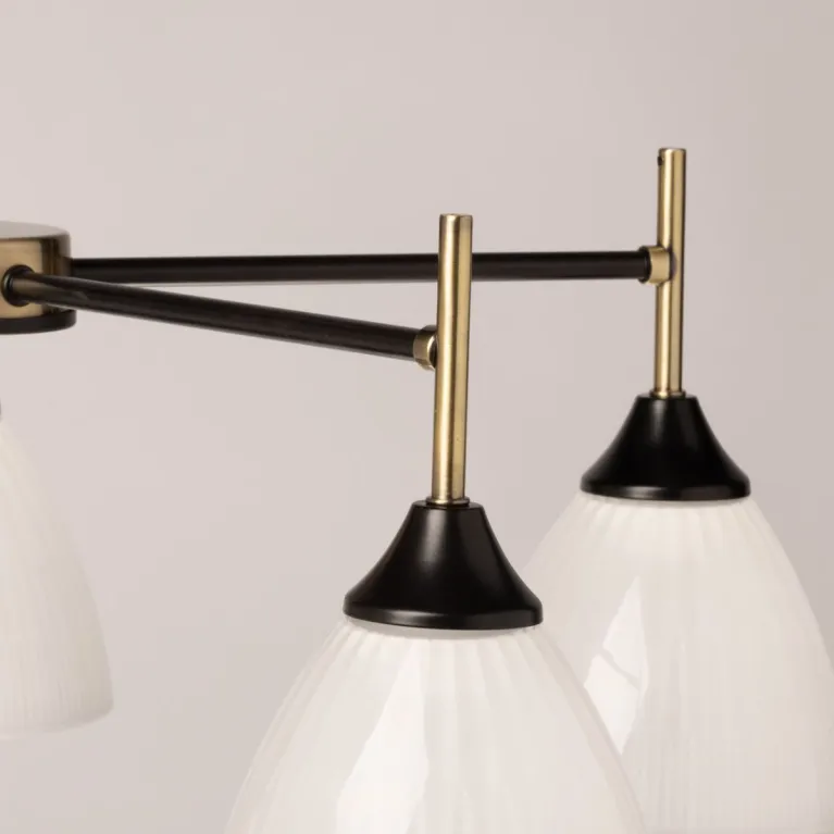Преобладающий цвет плафонов: Белый, арматуры: Черный; материал изготовления арматуры: Металл, размеры, мм: длина 630 / ширина 630 / высота 290 Общая мощность – 300 Ватт, а максимальная площадь освещения до 15 м2. Основной тип ламп, предусмотренный производителем: Накаливания с цоколем E27. В зависимости от предпочтений можно использовать лампы теплового, холодного или нейтрального света, за исключением люстр с типом цоколя LED.