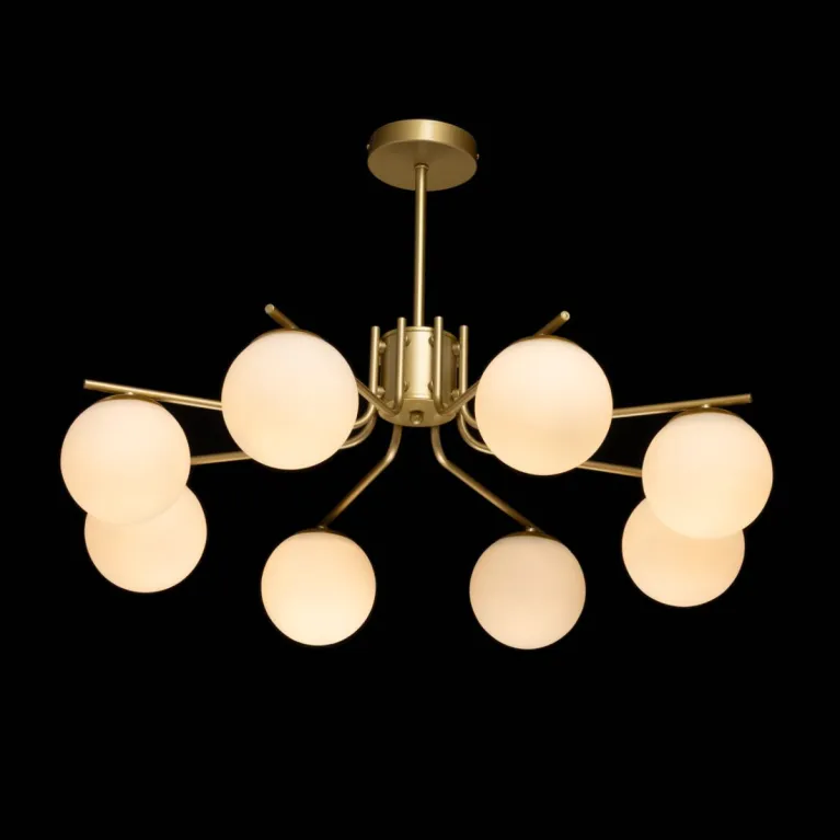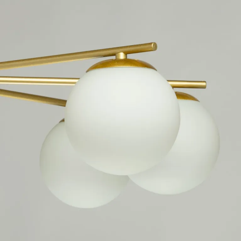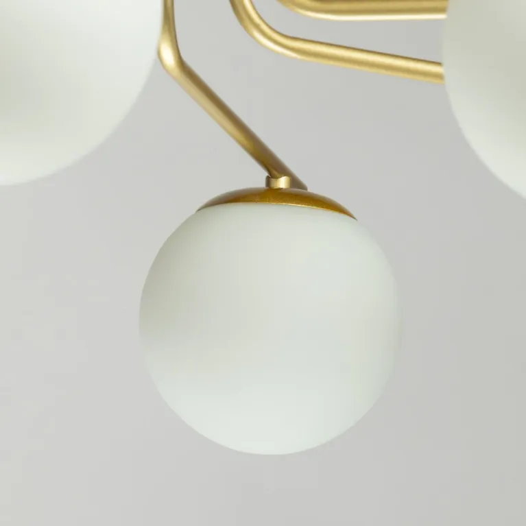 Преобладающий цвет плафонов: Белый, арматуры: Золото; материал изготовления арматуры: Металл, размеры, мм: / высота 480 / диаметр 750. Общая мощность – 480 Ватт, а максимальная площадь освещения до 16 м2. Основной тип ламп, предусмотренный производителем: Накаливания с цоколем E27. В зависимости от предпочтений можно использовать лампы теплового, холодного или нейтрального света, за исключением люстр с типом цоколя LED.