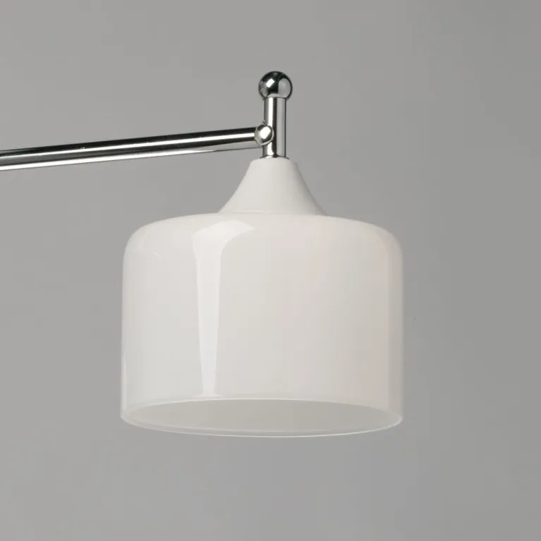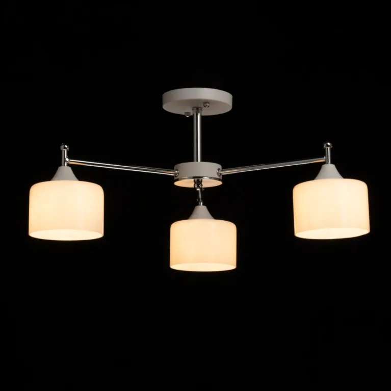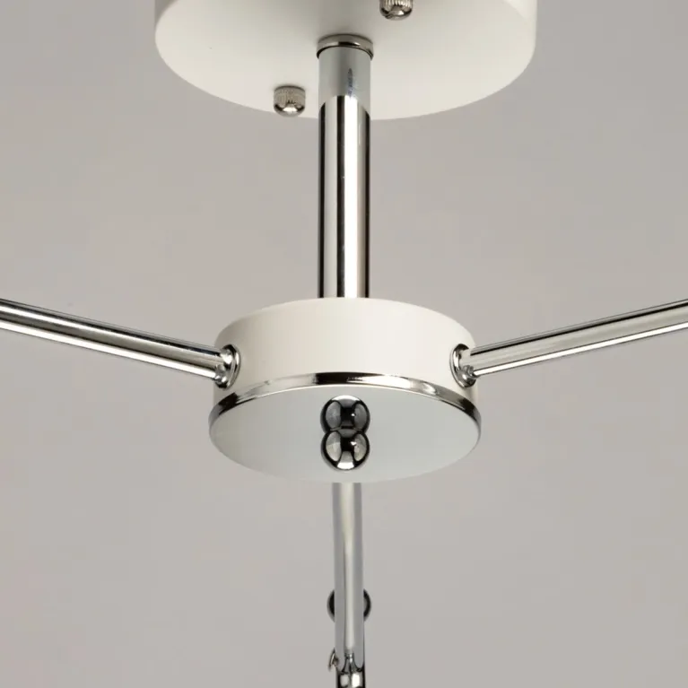 Преобладающий цвет плафонов: Белый, арматуры: Хром; материал изготовления арматуры: Металл, размеры, мм: длина 610 / ширина 610 / высота 260 Общая мощность – 180 Ватт, а максимальная площадь освещения до 9 м2. Основной тип ламп, предусмотренный производителем: Накаливания с цоколем E27. В зависимости от предпочтений можно использовать лампы теплового, холодного или нейтрального света, за исключением люстр с типом цоколя LED.