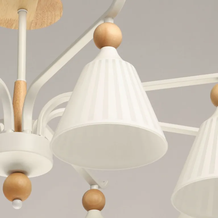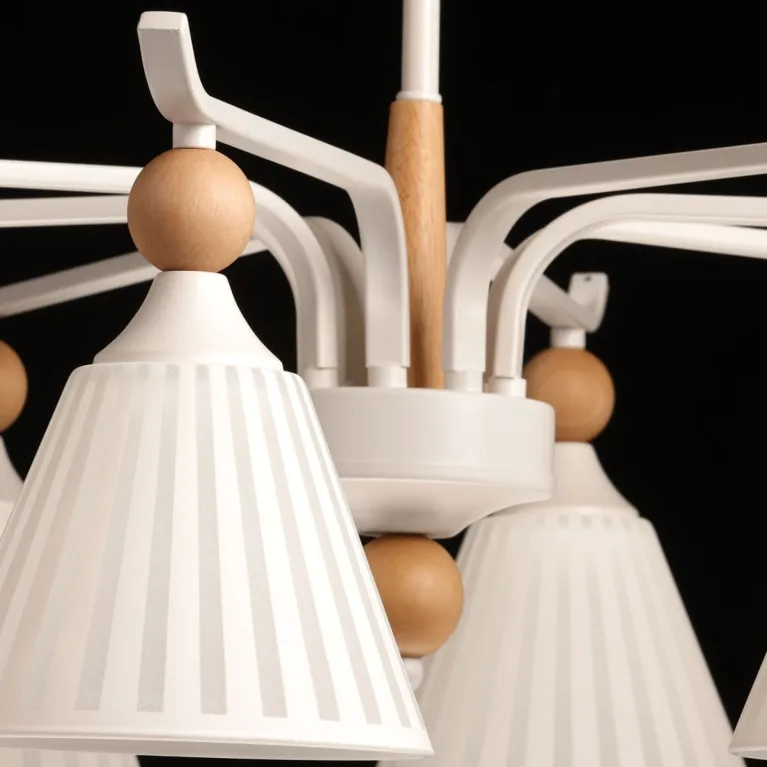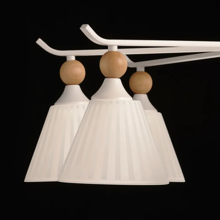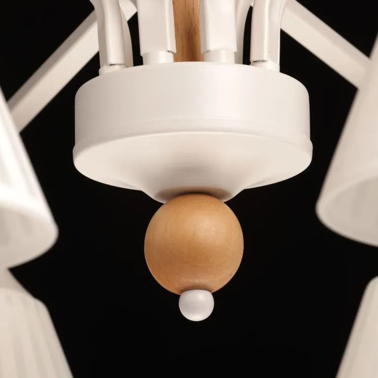 Преобладающий цвет плафонов: Белый, арматуры: Светло-коричневый; материал изготовления арматуры: Дерево, размеры, мм: / высота 400 / диаметр 780. Общая мощность – 480 Ватт, а максимальная площадь освещения до 24 м2. Основной тип ламп, предусмотренный производителем: Накаливания с цоколем E27. В зависимости от предпочтений можно использовать лампы теплового, холодного или нейтрального света, за исключением люстр с типом цоколя LED.