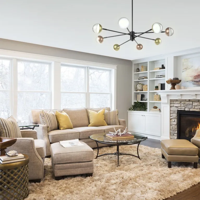 Преобладающий цвет плафонов: Золото, арматуры: Черный; материал изготовления арматуры: Металл, размеры, мм: длина 780 / ширина 780 / высота 670 Общая мощность – 90 Ватт, а максимальная площадь освещения до 25 м2. Основной тип ламп, предусмотренный производителем: Светодиодная с цоколем LED. В зависимости от предпочтений можно использовать лампы теплового, холодного или нейтрального света, за исключением люстр с типом цоколя LED.