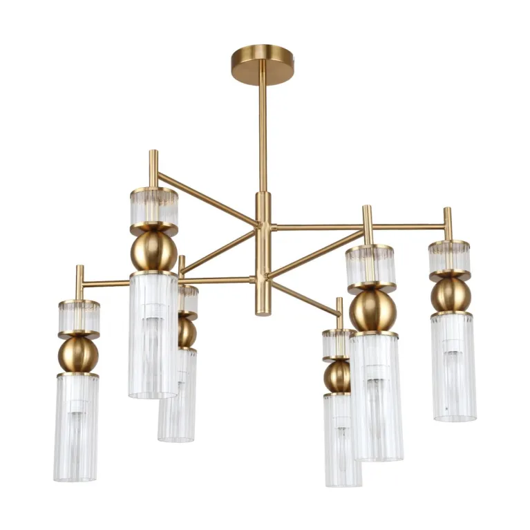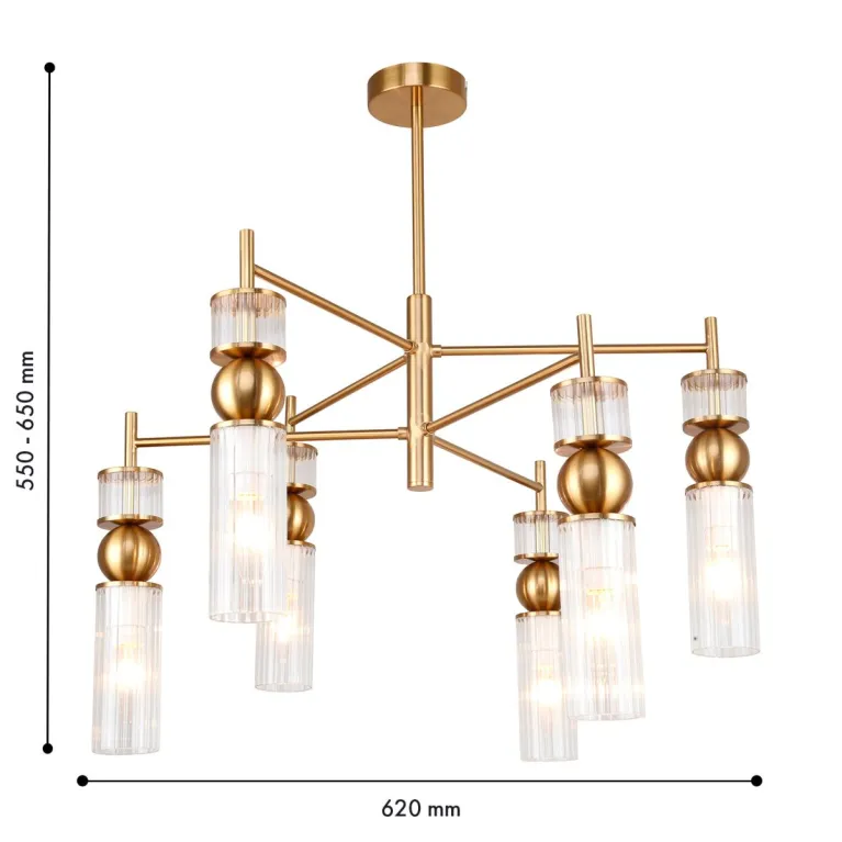 Преобладающий цвет плафонов: Прозрачный, арматуры: Латунь; материал изготовления арматуры: Металл, размеры, мм: / высота 650 / диаметр 620. Общая мощность – 240 Ватт, а максимальная площадь освещения до 12 м2. Основной тип ламп, предусмотренный производителем: Накаливания с цоколем E14. В зависимости от предпочтений можно использовать лампы теплового, холодного или нейтрального света, за исключением люстр с типом цоколя LED.