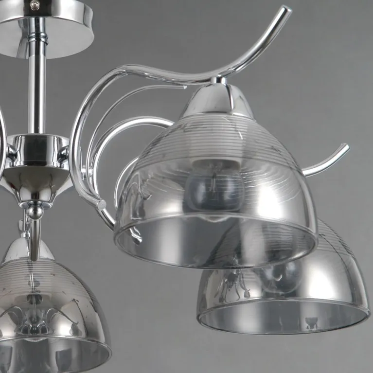 Преобладающий цвет плафонов: Дымчатый, арматуры: Хром; материал изготовления арматуры: Металл, размеры, мм: / высота 260 / диаметр 600. Общая мощность – 200 Ватт, а максимальная площадь освещения до 30 м2. Основной тип ламп, предусмотренный производителем: Накаливания с цоколем E27. В зависимости от предпочтений можно использовать лампы теплового, холодного или нейтрального света, за исключением люстр с типом цоколя LED.