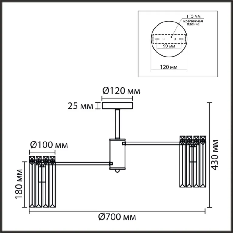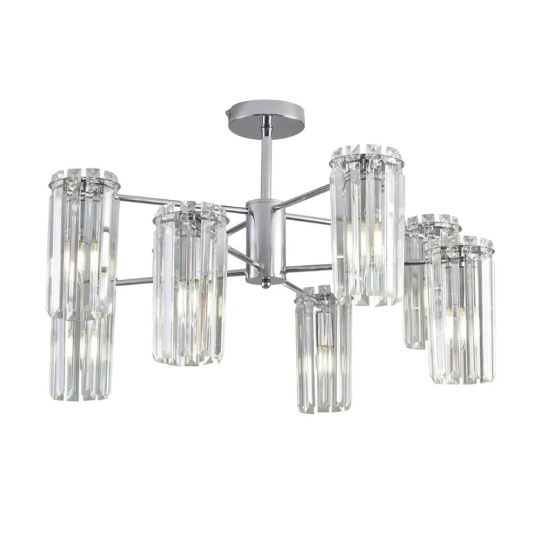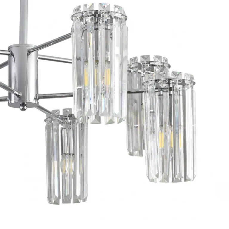 Преобладающий цвет плафонов: Прозрачный, арматуры: Хром; материал изготовления арматуры: Металл, размеры, мм: / высота 430 / диаметр 700. Общая мощность – 320 Ватт, а максимальная площадь освещения до 16 м2. Основной тип ламп, предусмотренный производителем: Накаливания с цоколем E14. В зависимости от предпочтений можно использовать лампы теплового, холодного или нейтрального света, за исключением люстр с типом цоколя LED.