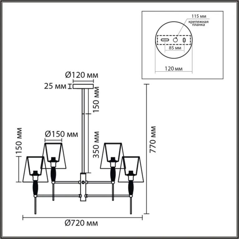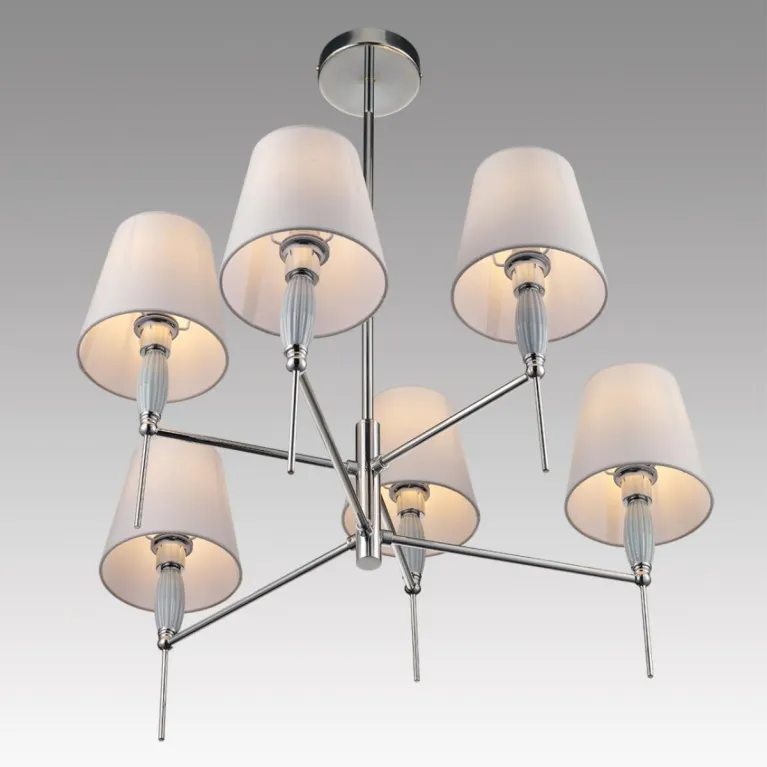Преобладающий цвет плафонов: Серый, арматуры: Хром; материал изготовления арматуры: Металл, размеры, мм: / высота 770 / диаметр 720. Общая мощность – 240 Ватт. Основной тип ламп, предусмотренный производителем: Накаливания с цоколем E14. В зависимости от предпочтений можно использовать лампы теплового, холодного или нейтрального света, за исключением люстр с типом цоколя LED.