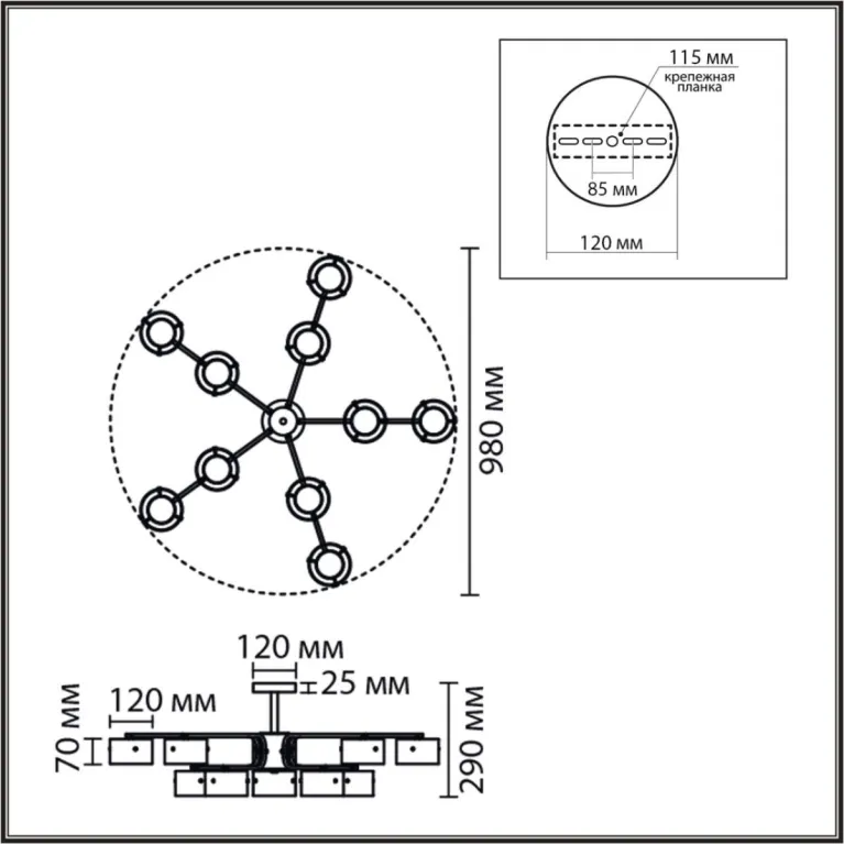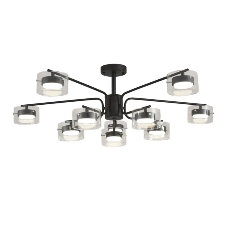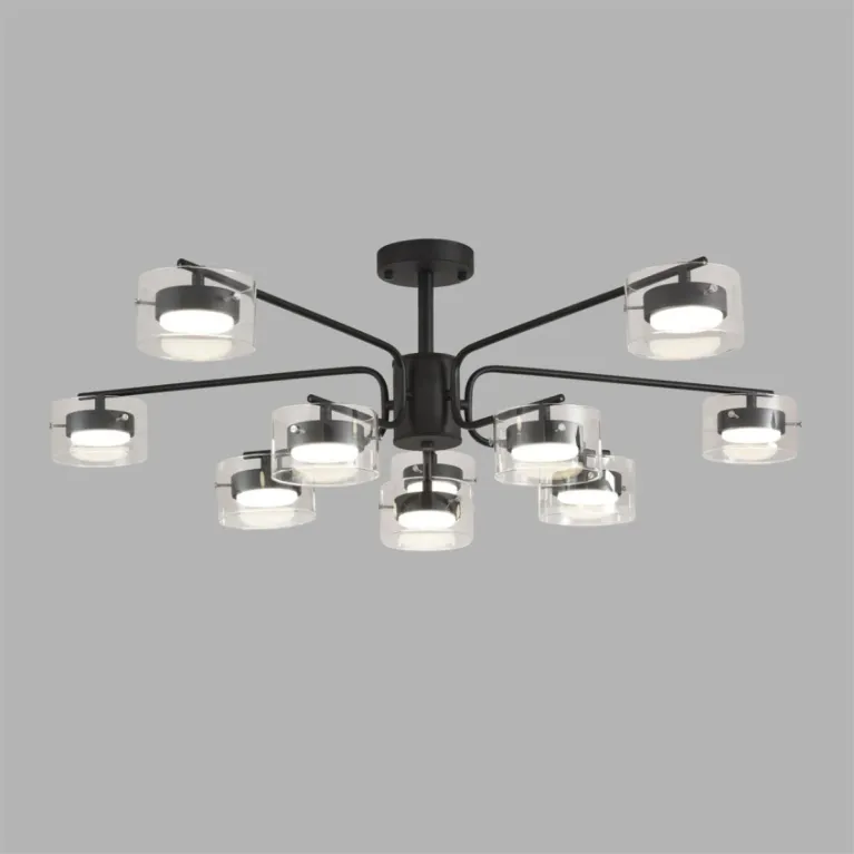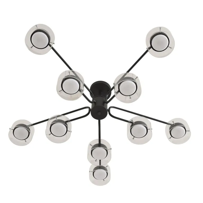 Преобладающий цвет плафонов: Прозрачный, арматуры: Черный; материал изготовления арматуры: Металл, размеры, мм: / высота 290 / диаметр 980. Общая мощность – 70 Ватт. Основной тип ламп, предусмотренный производителем: Светодиодная с цоколем GX53. В зависимости от предпочтений можно использовать лампы теплового, холодного или нейтрального света, за исключением люстр с типом цоколя LED.