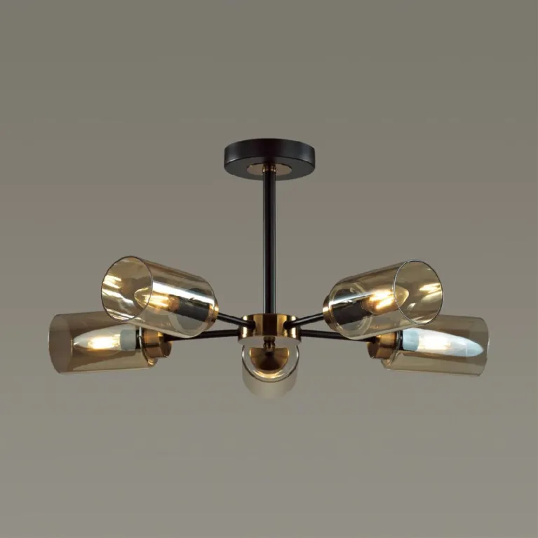 Пять плафонов, выполненных из стекла, обеспечивают равномерное распределение света по комнате. Их белый цвет и изящная форма придают люстре лёгкость и воздушность. Плафоны направлены вниз, что создаёт яркое и комфортное освещение.