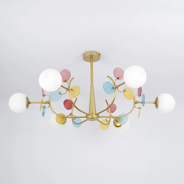 Преобладающий цвет плафонов: Белый, арматуры: Золото; материал изготовления арматуры: Металл, размеры, мм: / высота 500 / диаметр 1100. Общая мощность – 360 Ватт. Основной тип ламп, предусмотренный производителем: Накаливания с цоколем E27. В зависимости от предпочтений можно использовать лампы теплового, холодного или нейтрального света, за исключением люстр с типом цоколя LED.