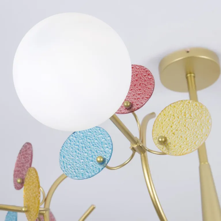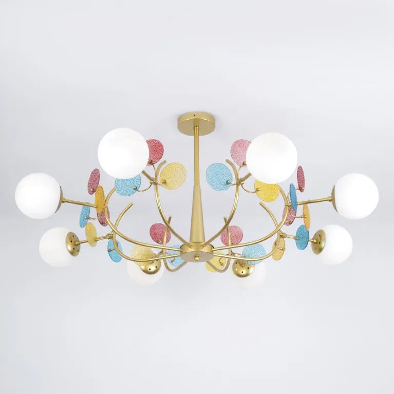 Преобладающий цвет плафонов: Белый, арматуры: Золото; материал изготовления арматуры: Металл, размеры, мм: / высота 500 / диаметр 1100. Общая мощность – 480 Ватт, а максимальная площадь освещения до 22 м2. Основной тип ламп, предусмотренный производителем: Накаливания с цоколем E27. В зависимости от предпочтений можно использовать лампы теплового, холодного или нейтрального света, за исключением люстр с типом цоколя LED.