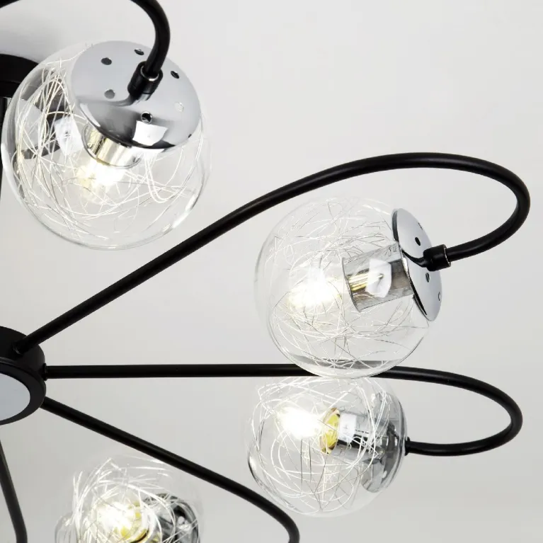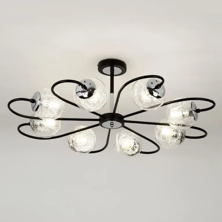 Преобладающий цвет плафонов: Прозрачный, арматуры: Черный; материал изготовления арматуры: Металл, размеры, мм: / высота 350 / диаметр 850. Общая мощность – 480 Ватт. Основной тип ламп, предусмотренный производителем: Накаливания с цоколем E27. В зависимости от предпочтений можно использовать лампы теплового, холодного или нейтрального света, за исключением люстр с типом цоколя LED.
