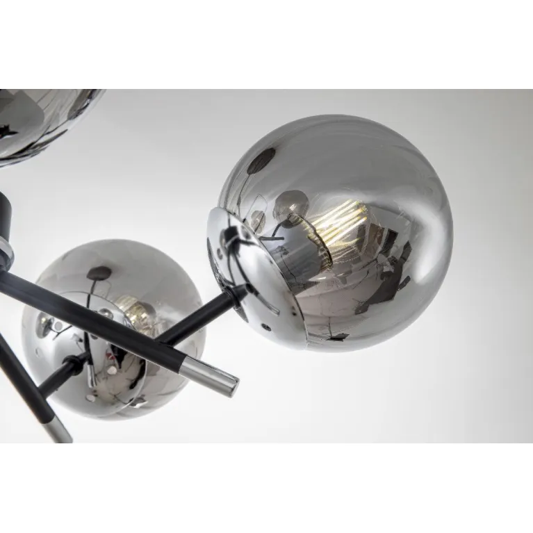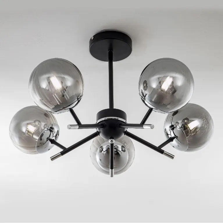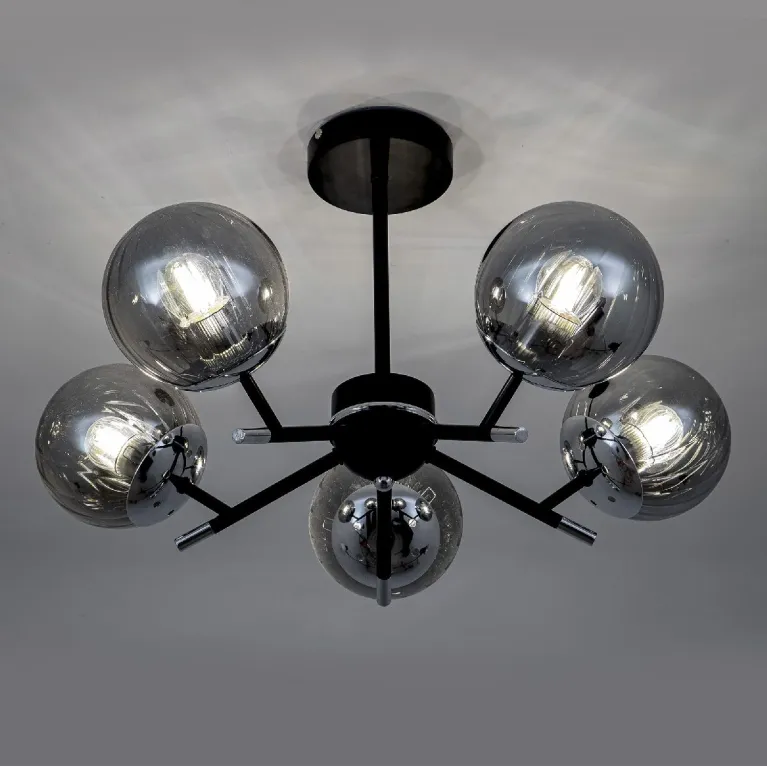 Преобладающий цвет плафонов: Дымчатый, арматуры: Черный; материал изготовления арматуры: Металл, размеры, мм: / высота 330 / диаметр 560. Общая мощность – 200 Ватт, а максимальная площадь освещения до 15 м2. Основной тип ламп, предусмотренный производителем: Накаливания с цоколем E27. В зависимости от предпочтений можно использовать лампы теплового, холодного или нейтрального света, за исключением люстр с типом цоколя LED.