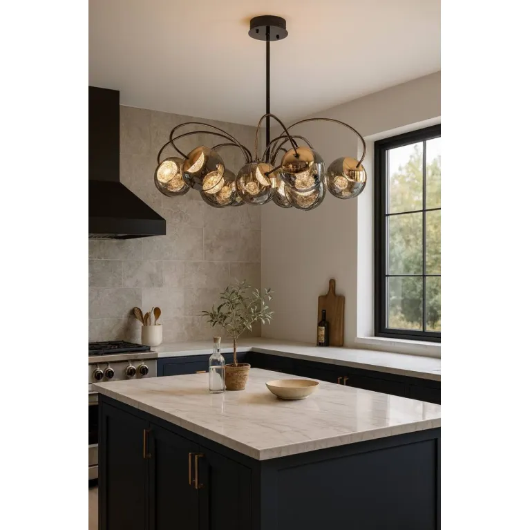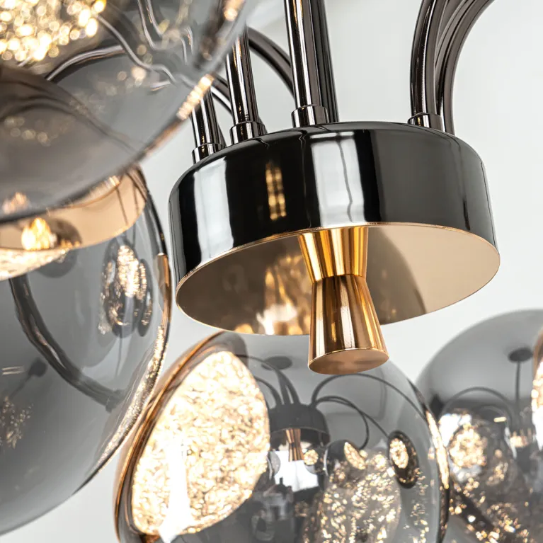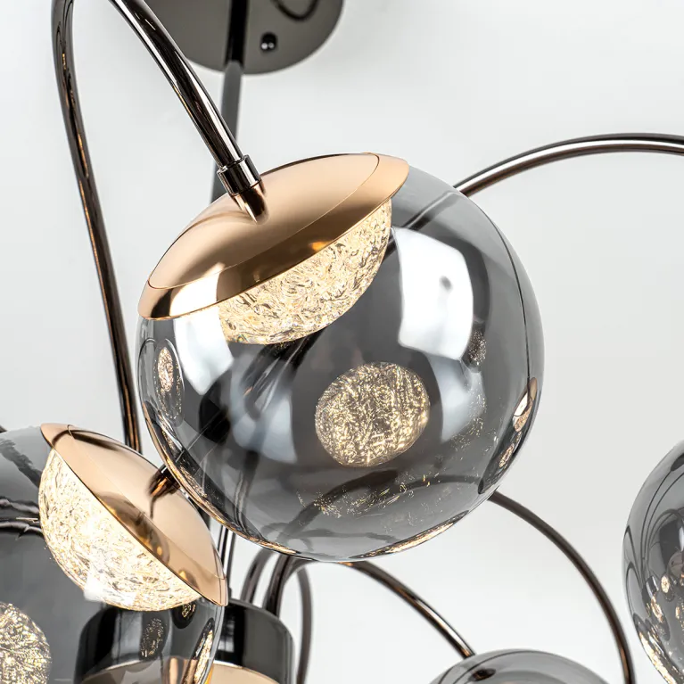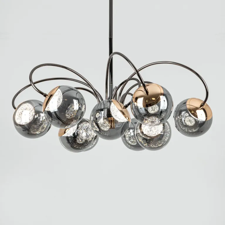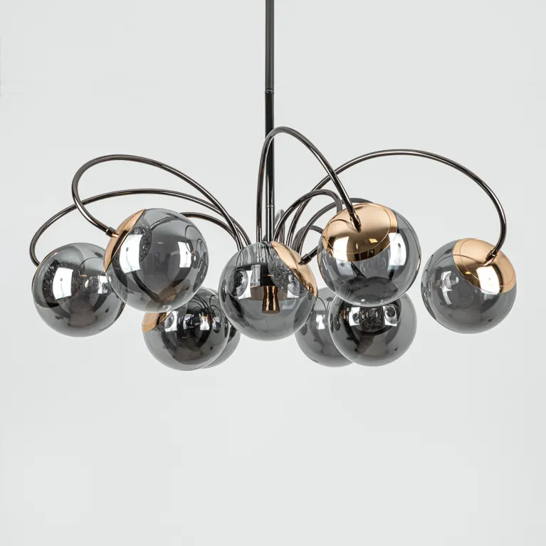 Преобладающий цвет плафонов: Дымчатый, арматуры: Черный; материал изготовления арматуры: Металл, размеры, мм: / высота 320 / диаметр 800. Общая мощность – 105 Ватт, а максимальная площадь освещения до 20 м2. Основной тип ламп, предусмотренный производителем: Светодиодная с цоколем LED. В зависимости от предпочтений можно использовать лампы теплового, холодного или нейтрального света, за исключением люстр с типом цоколя LED.