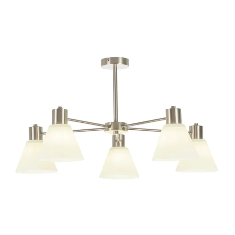 Преобладающий цвет плафонов: Белый, арматуры: Никель; материал изготовления арматуры: Металл, размеры, мм: / высота 380 / диаметр 760. Общая мощность – 300 Ватт, а максимальная площадь освещения до 15 м2. Основной тип ламп, предусмотренный производителем: Накаливания с цоколем E27. В зависимости от предпочтений можно использовать лампы теплового, холодного или нейтрального света, за исключением люстр с типом цоколя LED.