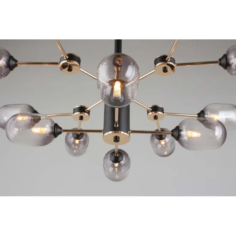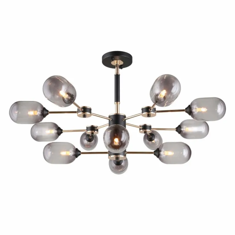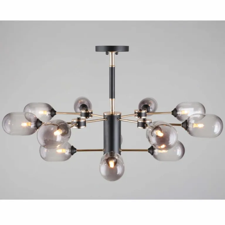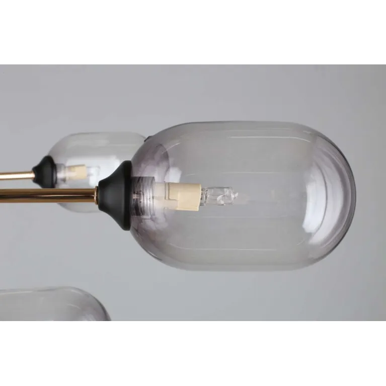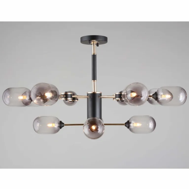 Преобладающий цвет плафонов: Прозрачный, арматуры: Черный; материал изготовления арматуры: Металл, размеры, мм: / высота 550 / диаметр 1000. Общая мощность – 480 Ватт, а максимальная площадь освещения до 26 м2. Основной тип ламп, предусмотренный производителем: Галогеновая с цоколем G9. В зависимости от предпочтений можно использовать лампы теплового, холодного или нейтрального света, за исключением люстр с типом цоколя LED.