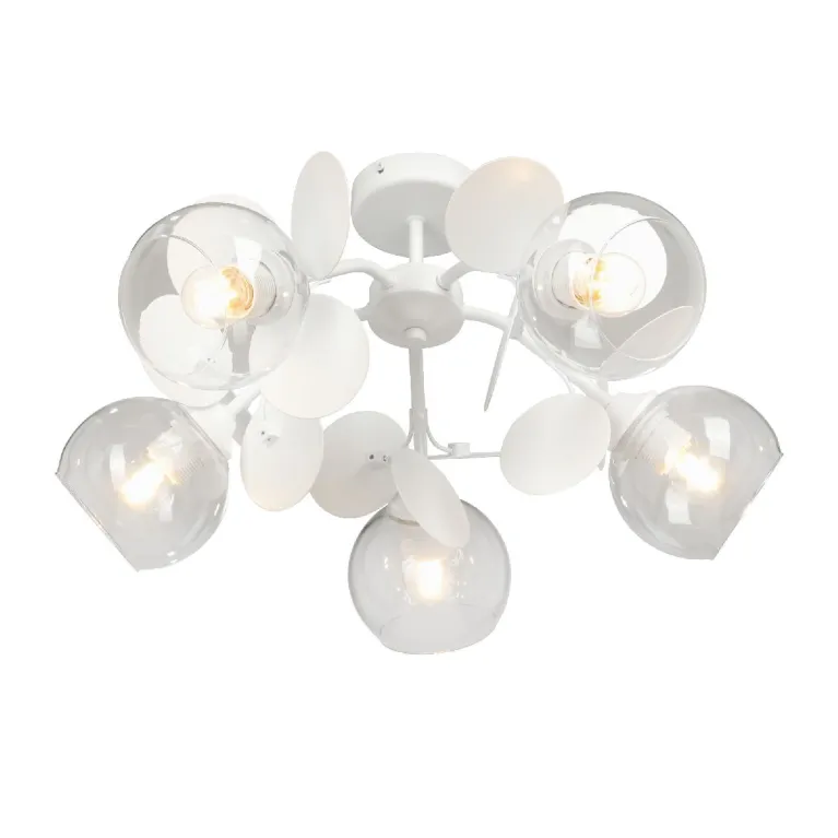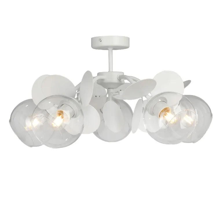 Преобладающий цвет плафонов: Прозрачный, арматуры: Белый; материал изготовления арматуры: Металл, размеры, мм: / высота 280 / диаметр 580. Общая мощность – 200 Ватт, а максимальная площадь освещения до 15 м2. Основной тип ламп, предусмотренный производителем: Накаливания с цоколем E27. В зависимости от предпочтений можно использовать лампы теплового, холодного или нейтрального света, за исключением люстр с типом цоколя LED.