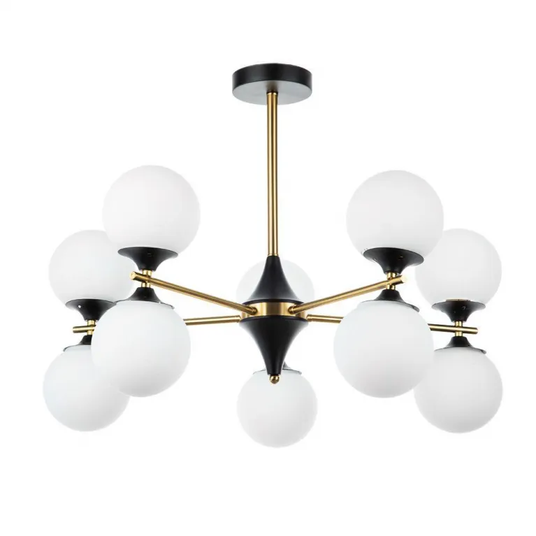 Люстра выполнена из прочного металла с черным матовым покрытием и подвеса длиной 1200 мм. Основание диаметром 700 мм украшено десятью белыми матовыми абажурами из акрила, которые обеспечивают мягкое и равномерное рассеивание света. Максимальная мощность люстры на один цоколь составляет 60 Вт, что позволяет использовать лампы накаливания, светодиодные или энергосберегающие.
