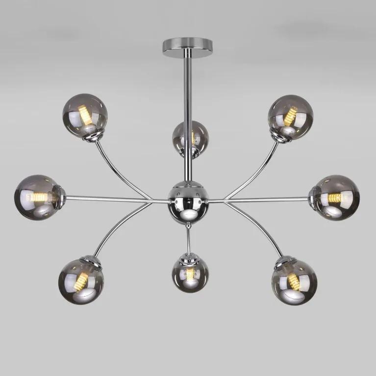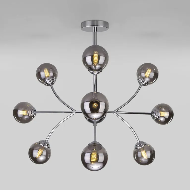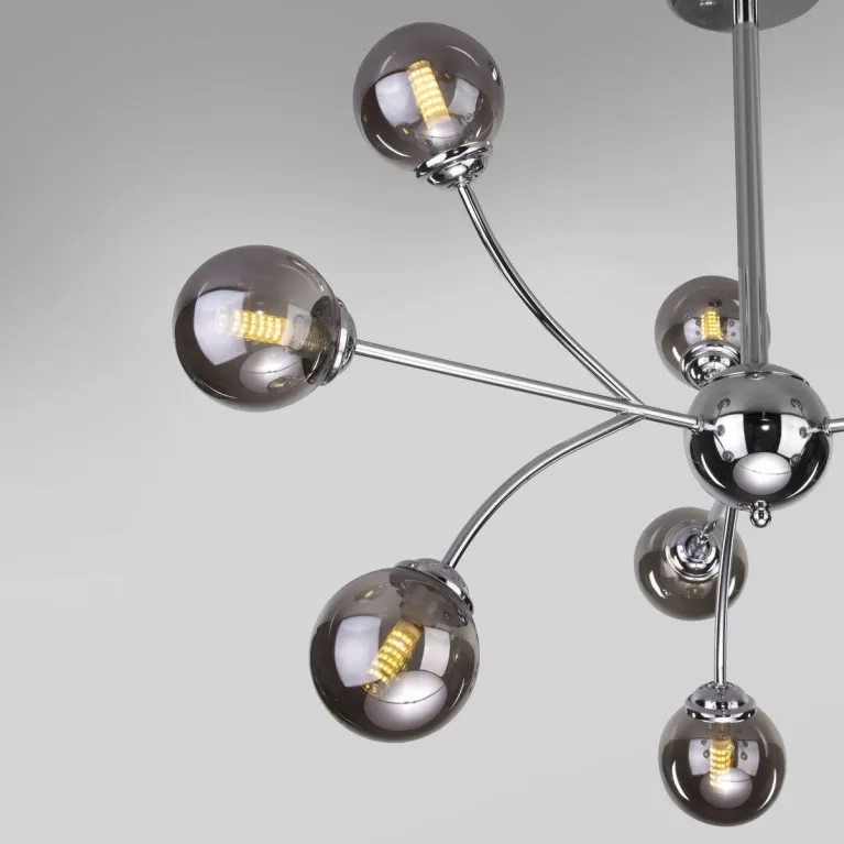 Преобладающий цвет люстры: Дымчатый, плафонов: Дымчатый, арматуры: Хром; материал изготовления арматуры: Металл, размеры, мм: / высота 600 / диаметр 810. Общая мощность – 45 Ватт, а максимальная площадь освещения до 9 м2. Основной тип ламп, предусмотренный производителем: Светодиодная с цоколем G9. В зависимости от предпочтений можно использовать лампы теплового, холодного или нейтрального света, за исключением люстр с типом цоколя LED.