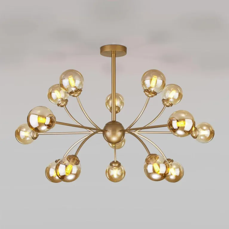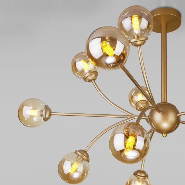 Преобладающий цвет люстры: Янтарный, плафонов: Янтарный, арматуры: Золотой; материал изготовления арматуры: Металл, размеры, мм: / высота 590 / диаметр 960. Общая мощность – 75 Ватт, а максимальная площадь освещения до 15 м2. Основной тип ламп, предусмотренный производителем: Светодиодная с цоколем G9. В зависимости от предпочтений можно использовать лампы теплового, холодного или нейтрального света, за исключением люстр с типом цоколя LED.