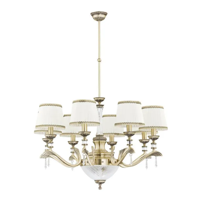 Преобладающий цвет люстры: Бронза, арматуры: Бронза; материал изготовления арматуры: Металл, размеры, мм: / высота 700 / диаметр 860. Общая мощность – 400 Ватт. Основной тип ламп, предусмотренный производителем: Накаливания с цоколем E14. В зависимости от предпочтений можно использовать лампы теплового, холодного или нейтрального света, за исключением люстр с типом цоколя LED.