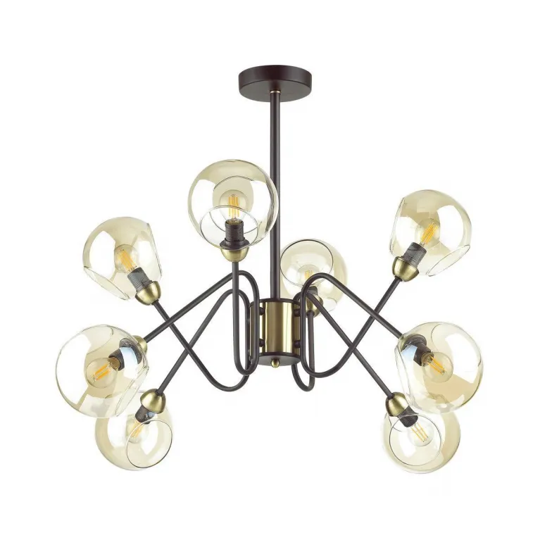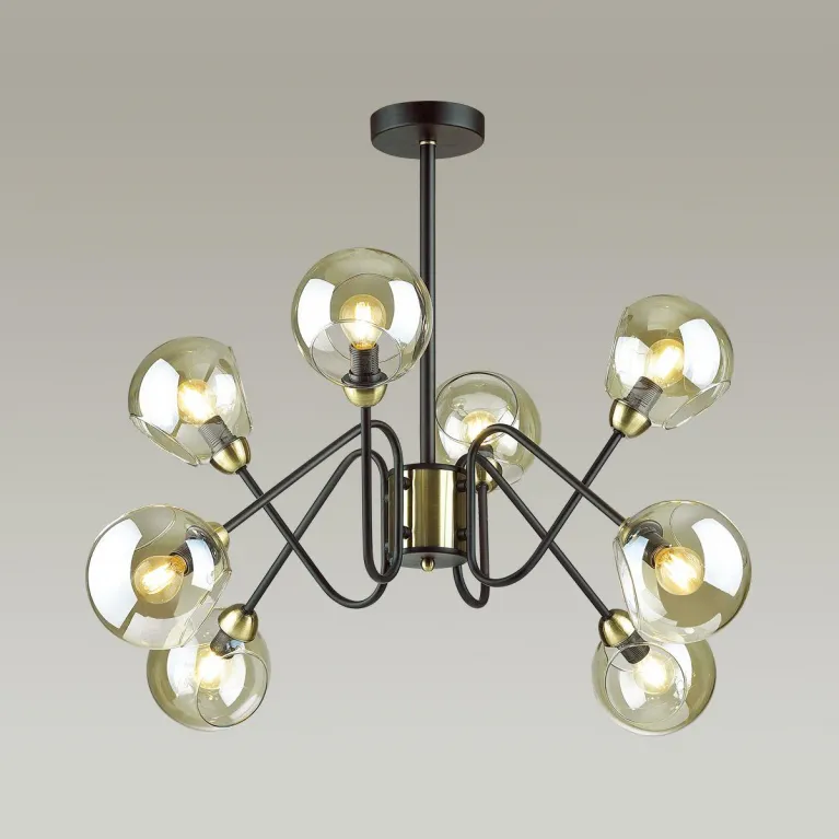 Преобладающий цвет люстры: Янтарный, плафонов: Янтарный, арматуры: Черный; материал изготовления арматуры: Металл, размеры, мм: / высота 600 / диаметр 820. Общая мощность – 320 Ватт. Основной тип ламп, предусмотренный производителем: Накаливания с цоколем E14. В зависимости от предпочтений можно использовать лампы теплового, холодного или нейтрального света, за исключением люстр с типом цоколя LED.