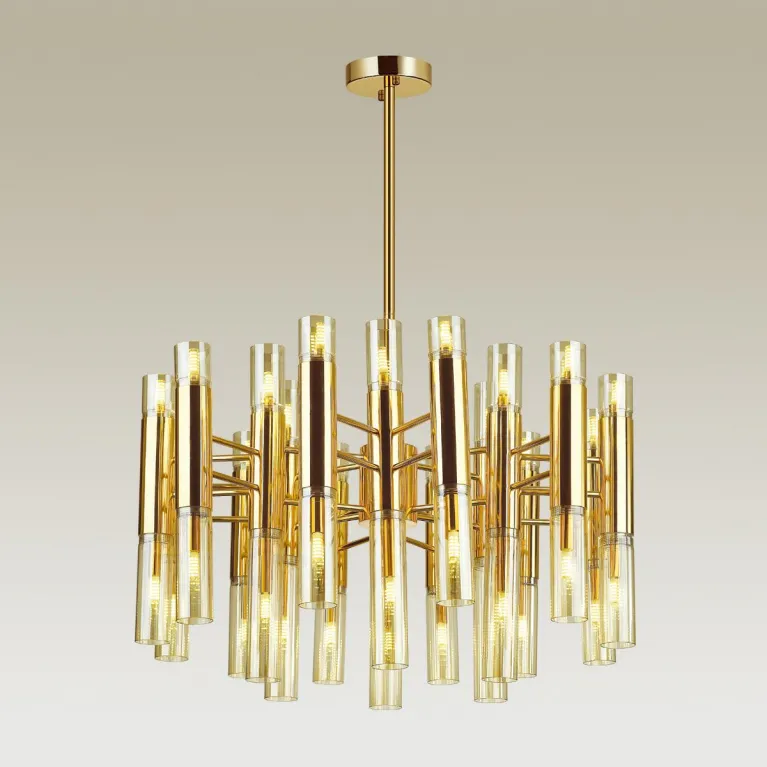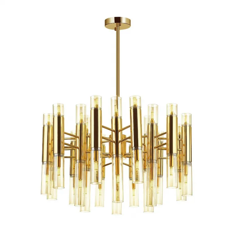 Преобладающий цвет люстры: Янтарный, плафонов: Янтарный, арматуры: Золото; материал изготовления арматуры: Металл, размеры, мм: / высота 570 / диаметр 860. Общая мощность – 1440 Ватт. Основной тип ламп, предусмотренный производителем: Галогеновая с цоколем G9. В зависимости от предпочтений можно использовать лампы теплового, холодного или нейтрального света, за исключением люстр с типом цоколя LED.