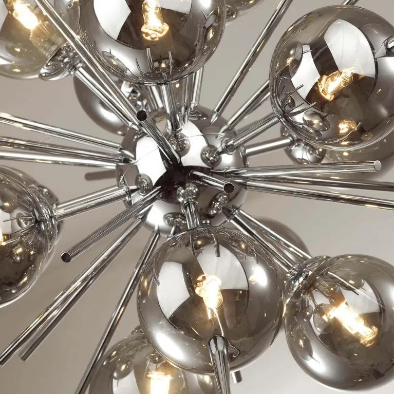 Преобладающий цвет люстры: Дымчатый, плафонов: Дымчатый, арматуры: Хром; материал изготовления арматуры: Металл, размеры, мм: / высота 585 / диаметр 585. Общая мощность – 480 Ватт. Основной тип ламп, предусмотренный производителем: Галогеновая с цоколем G9. В зависимости от предпочтений можно использовать лампы теплового, холодного или нейтрального света, за исключением люстр с типом цоколя LED.