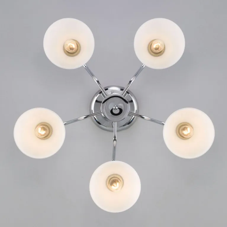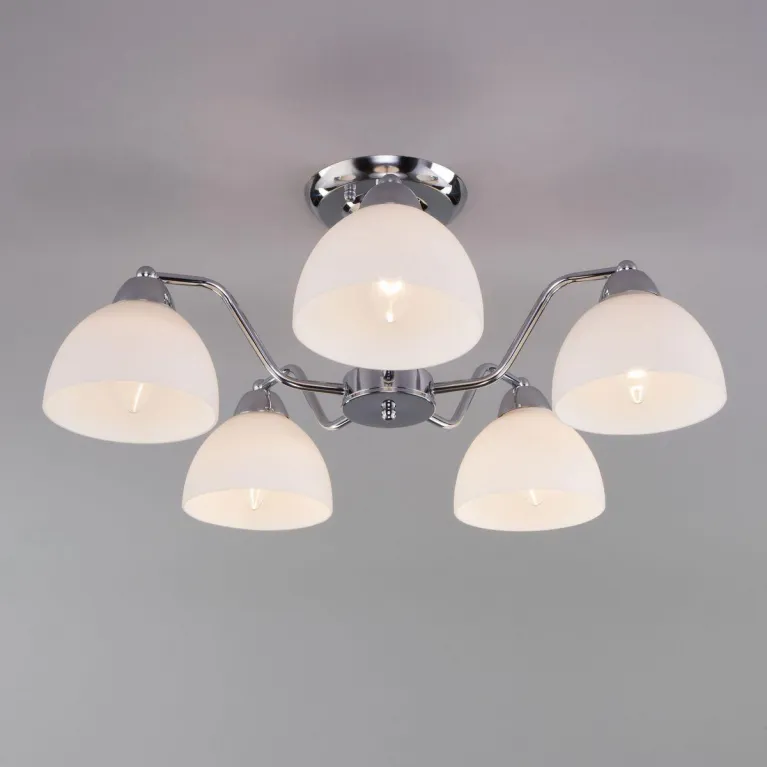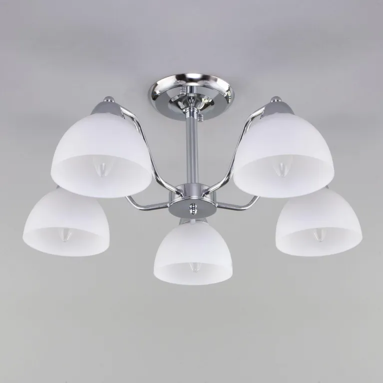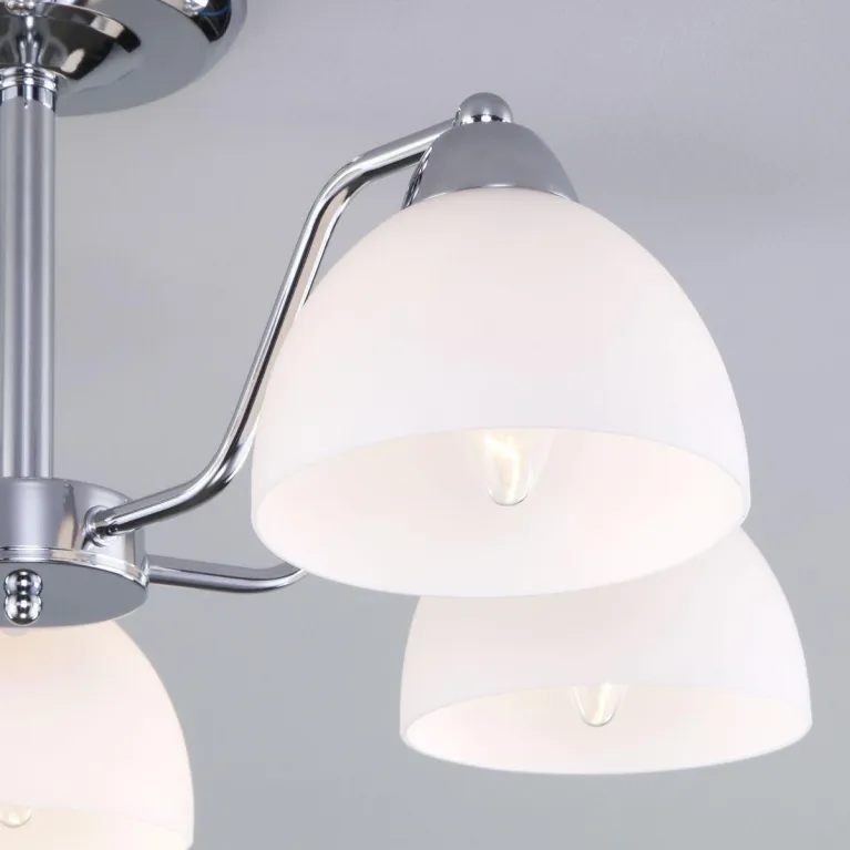Преобладающий цвет люстры: Белый, плафонов: Белый, арматуры: Хром; материал изготовления арматуры: Металл, размеры, мм: / высота 225 / диаметр 590. Общая мощность – 200 Ватт, а максимальная площадь освещения до 13 м2. Основной тип ламп, предусмотренный производителем: Накаливания с цоколем E27. В зависимости от предпочтений можно использовать лампы теплового, холодного или нейтрального света, за исключением люстр с типом цоколя LED.