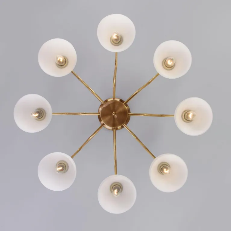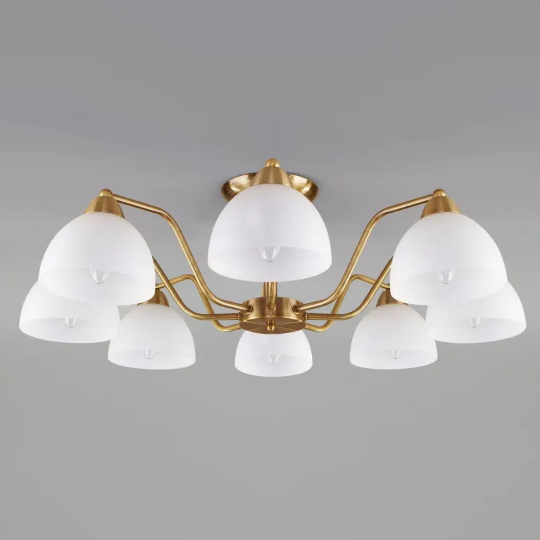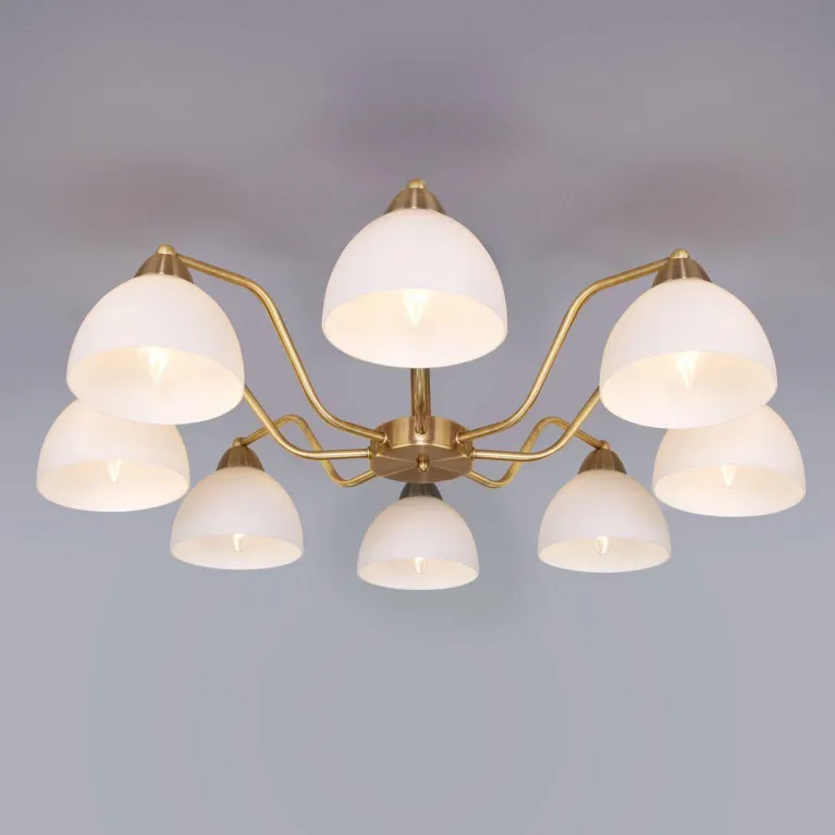 Преобладающий цвет люстры: Белый, плафонов: Белый, арматуры: Античная бронза; материал изготовления арматуры: Металл, размеры, мм: / высота 225 / диаметр 740. Общая мощность – 320 Ватт, а максимальная площадь освещения до 21 м2. Основной тип ламп, предусмотренный производителем: Накаливания с цоколем E27. В зависимости от предпочтений можно использовать лампы теплового, холодного или нейтрального света, за исключением люстр с типом цоколя LED.