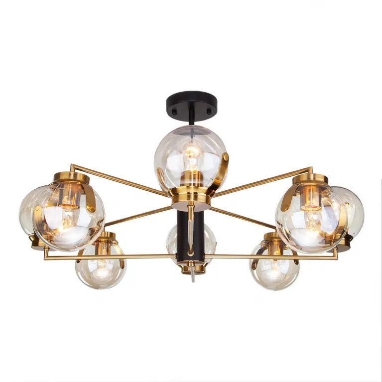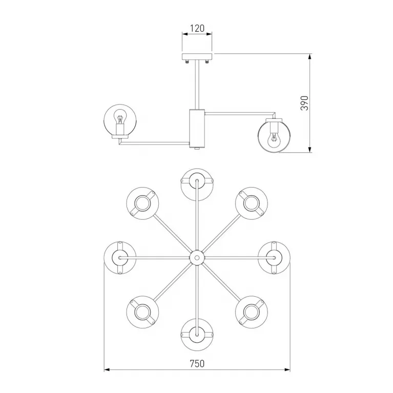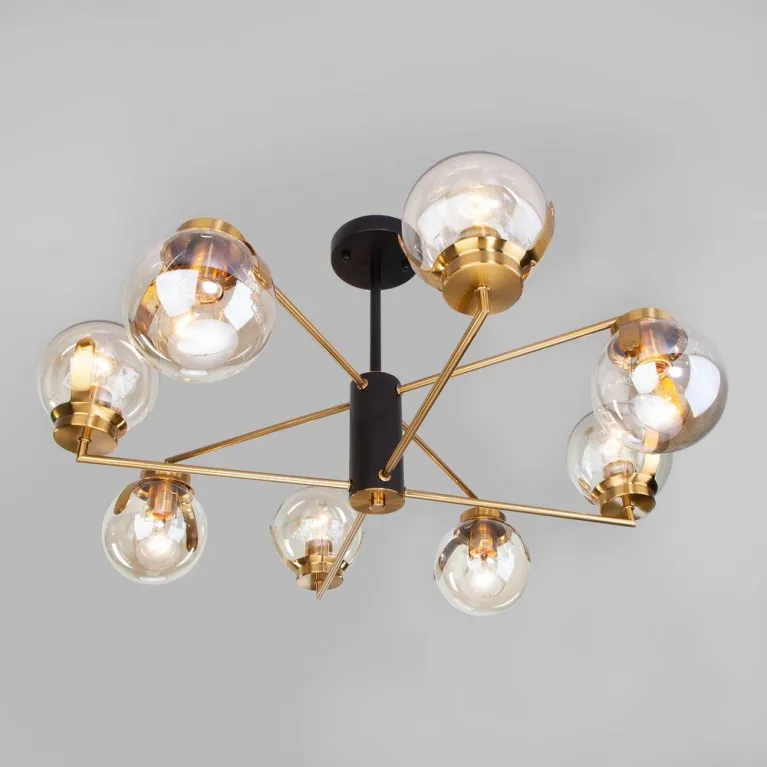 Корпус люстры изготовлен из прочного металла с черным матовым покрытием, что придаёт ей элегантный и современный вид. Она оснащена восемью патронами для ламп с цоколем E27, что позволяет использовать различные виды ламп — от традиционных ламп накаливания до энергосберегающих и светодиодных. Максимальная мощность каждой лампы — 40 Вт, что обеспечивает достаточное освещение пространства площадью до 32 м².