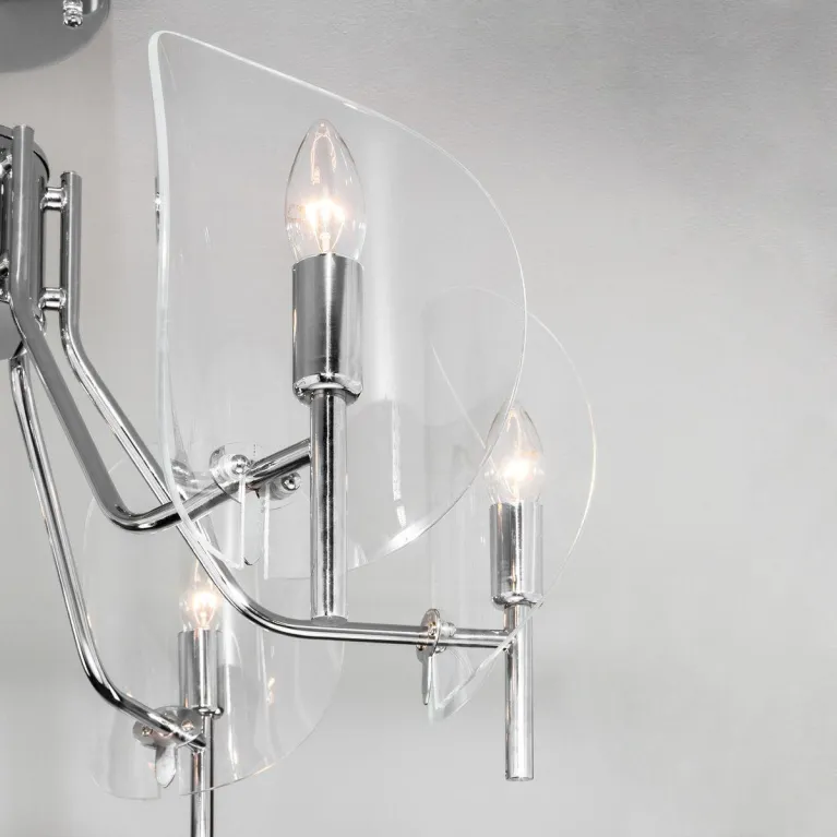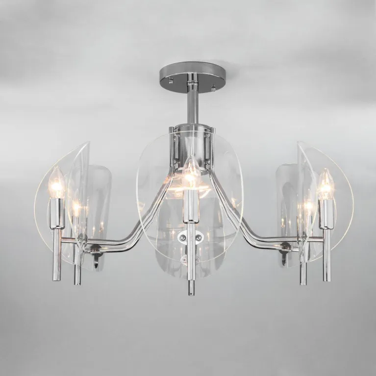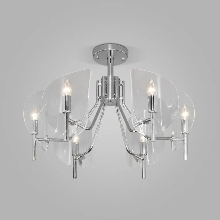 Преобладающий цвет люстры: Хром, плафонов: Прозрачный, арматуры: Хром; материал изготовления арматуры: Металл, размеры, мм: / высота 470 / диаметр 670. Общая мощность – 240 Ватт, а максимальная площадь освещения до 10 м2. Основной тип ламп, предусмотренный производителем: Накаливания с цоколем E14. В зависимости от предпочтений можно использовать лампы теплового, холодного или нейтрального света, за исключением люстр с типом цоколя LED.