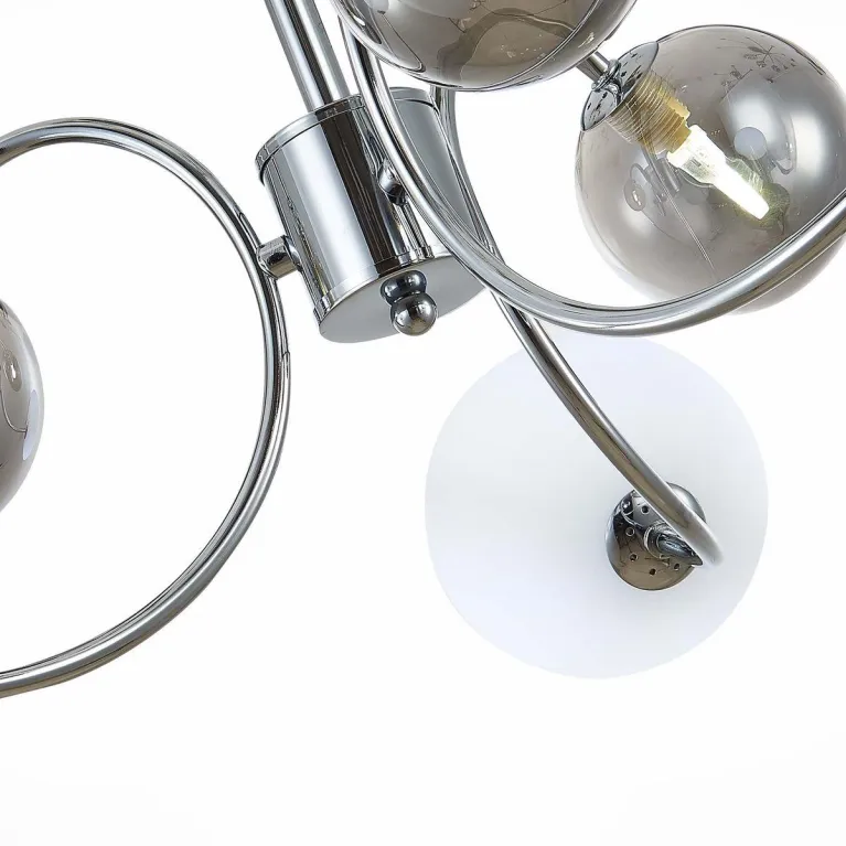 Корпус люстры выполнен из прочного металла с эффектным хромированным покрытием, которое придает изделию современный и стильный вид. Плафоны изготовлены из белого матового стекла, что создает мягкое и равномерное рассеивание света.