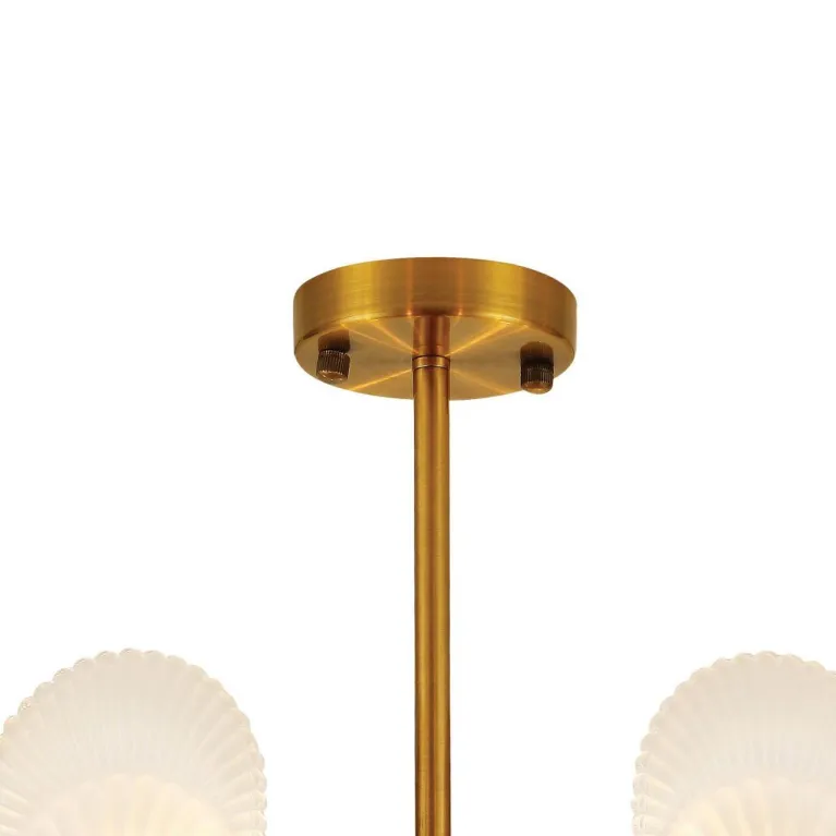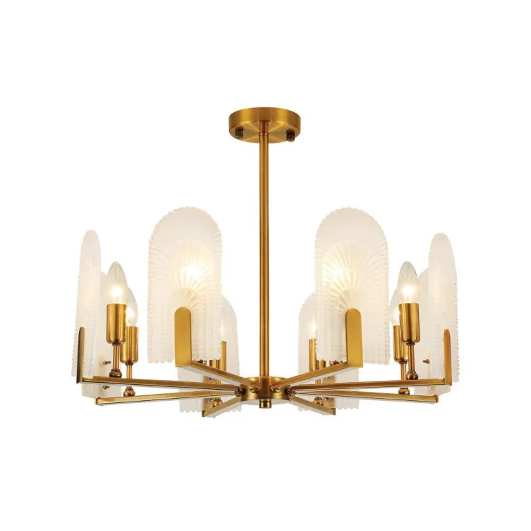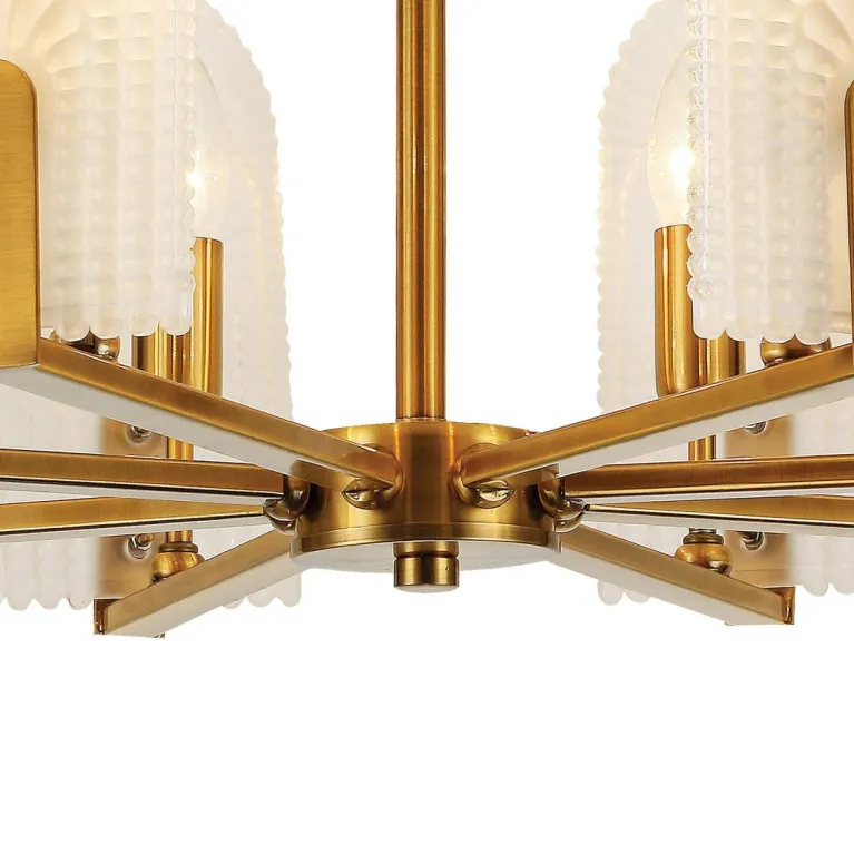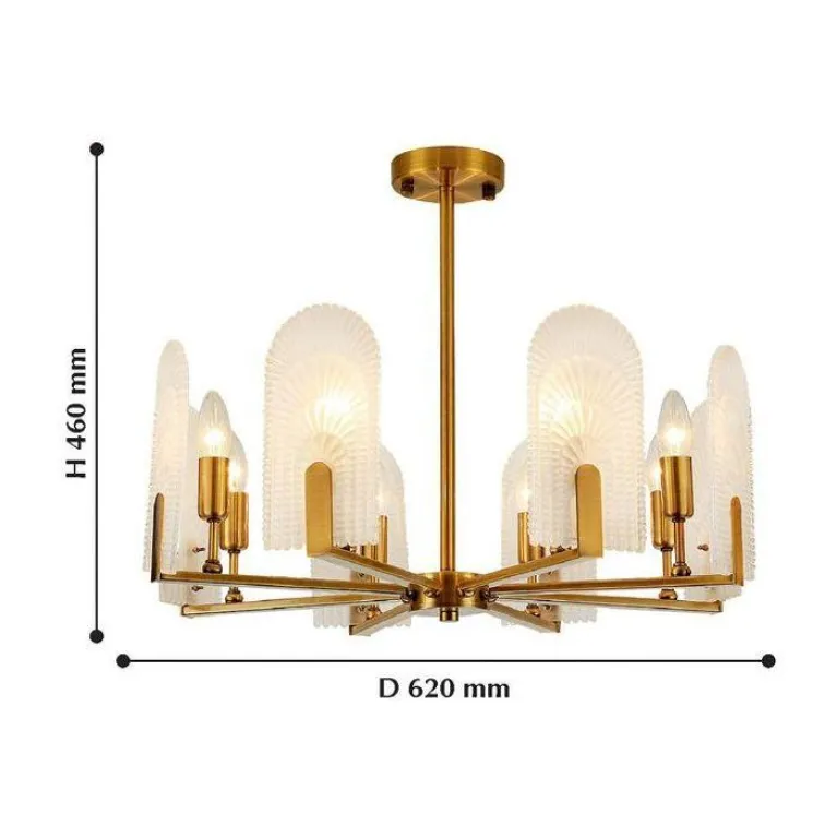 Преобладающий цвет люстры: Латунь, плафонов: Матовый, арматуры: Латунь; материал изготовления арматуры: Металл, размеры, мм: / высота 460 / диаметр 620. Общая мощность – 320 Ватт. Основной тип ламп, предусмотренный производителем: Накаливания с цоколем E14. В зависимости от предпочтений можно использовать лампы теплового, холодного или нейтрального света, за исключением люстр с типом цоколя LED.
