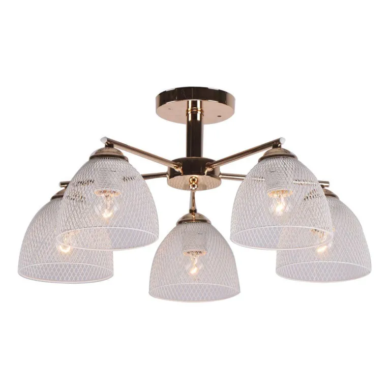 Преобладающий цвет люстры: Белый, плафонов: Белый, арматуры: Золотой; материал изготовления арматуры: Металл, размеры, мм: / высота 240 / диаметр 490. Общая мощность – 300 Ватт. Основной тип ламп, предусмотренный производителем: Накаливания с цоколем E27. В зависимости от предпочтений можно использовать лампы теплового, холодного или нейтрального света, за исключением люстр с типом цоколя LED.