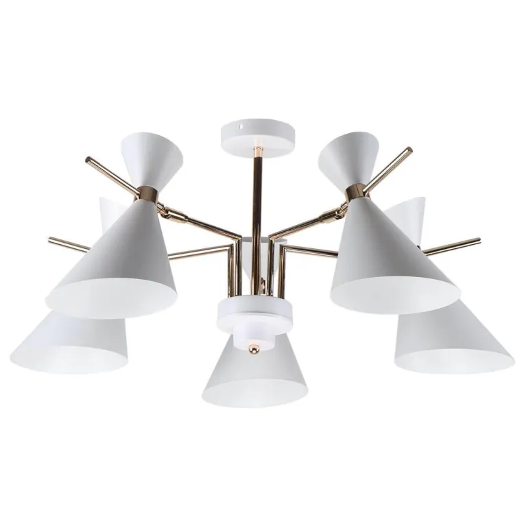 Люстра выполнена из прочного металла с белым эмалированным покрытием, которое придаёт изделию современный и элегантный вид. Плафоны из матового стекла обеспечивают мягкое и равномерное рассеивание света, создавая комфортное освещение в помещении.
