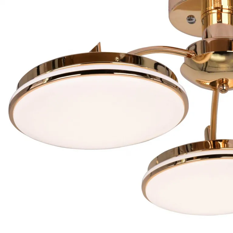 Преобладающий цвет люстры: Белый, плафонов: Белый, арматуры: Золото; материал изготовления арматуры: Металл, размеры, мм: / высота 225 / диаметр 600. Общая мощность – 72 Ватт. Основной тип ламп, предусмотренный производителем: Светодиодная с цоколем LED. В зависимости от предпочтений можно использовать лампы теплового, холодного или нейтрального света, за исключением люстр с типом цоколя LED.
