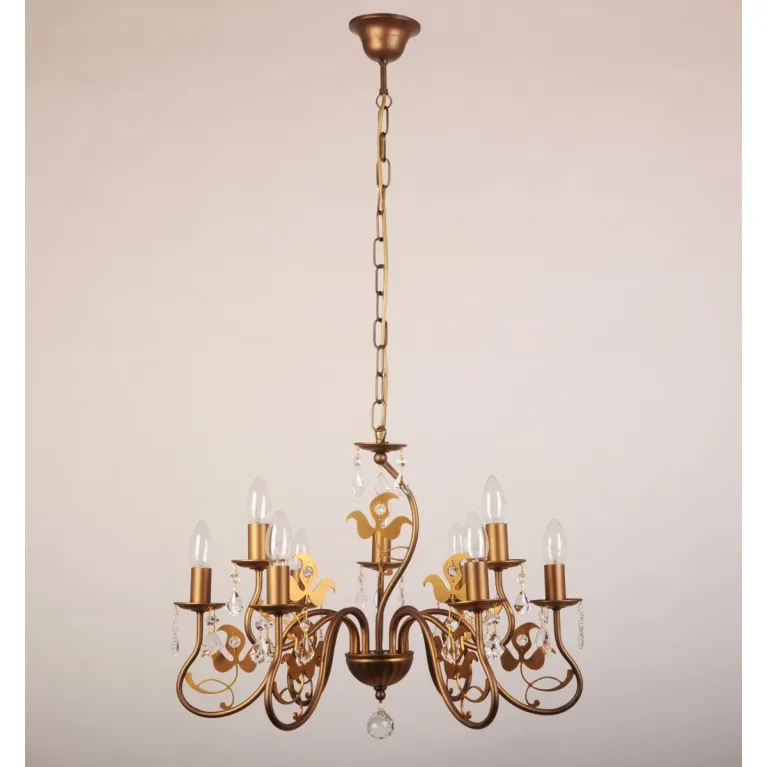 Преобладающий цвет арматуры: Коричневый; материал изготовления арматуры: Металл, размеры, мм: / высота 450 / диаметр 600. Общая мощность – 360 Ватт, а максимальная площадь освещения до 22 м2. Основной тип ламп, предусмотренный производителем: Накаливания с цоколем E14. В зависимости от предпочтений можно использовать лампы теплового, холодного или нейтрального света, за исключением люстр с типом цоколя LED.