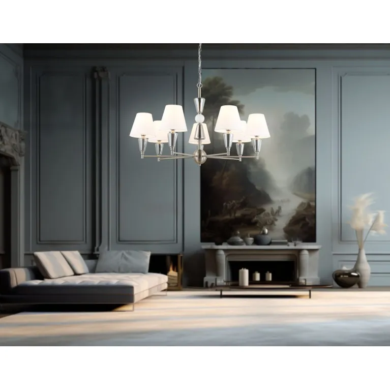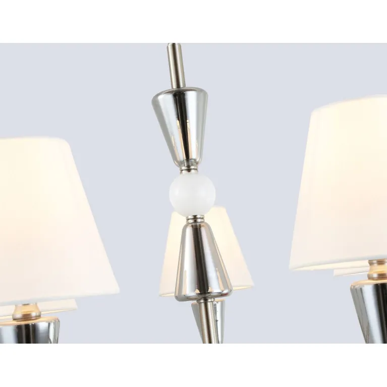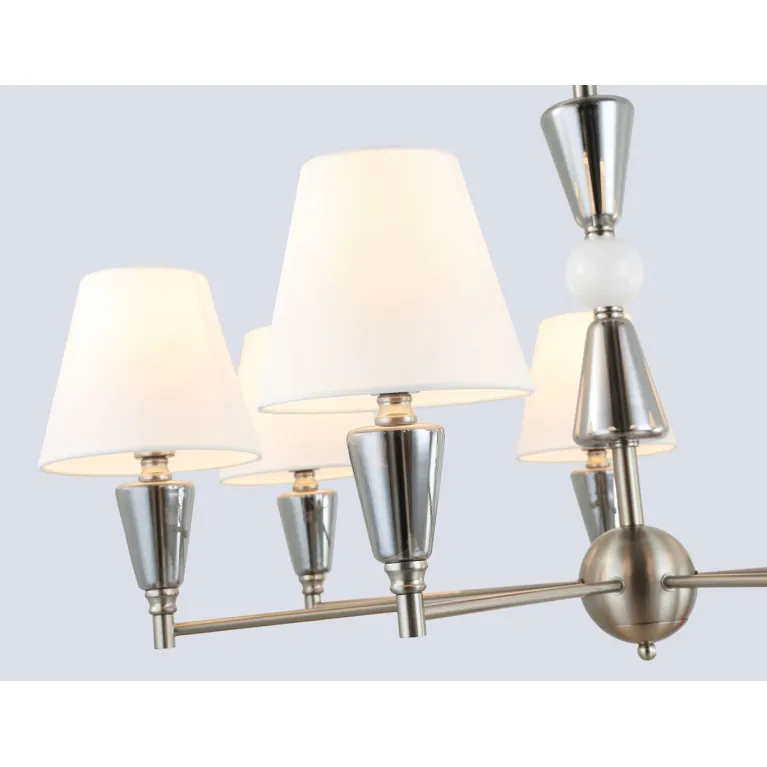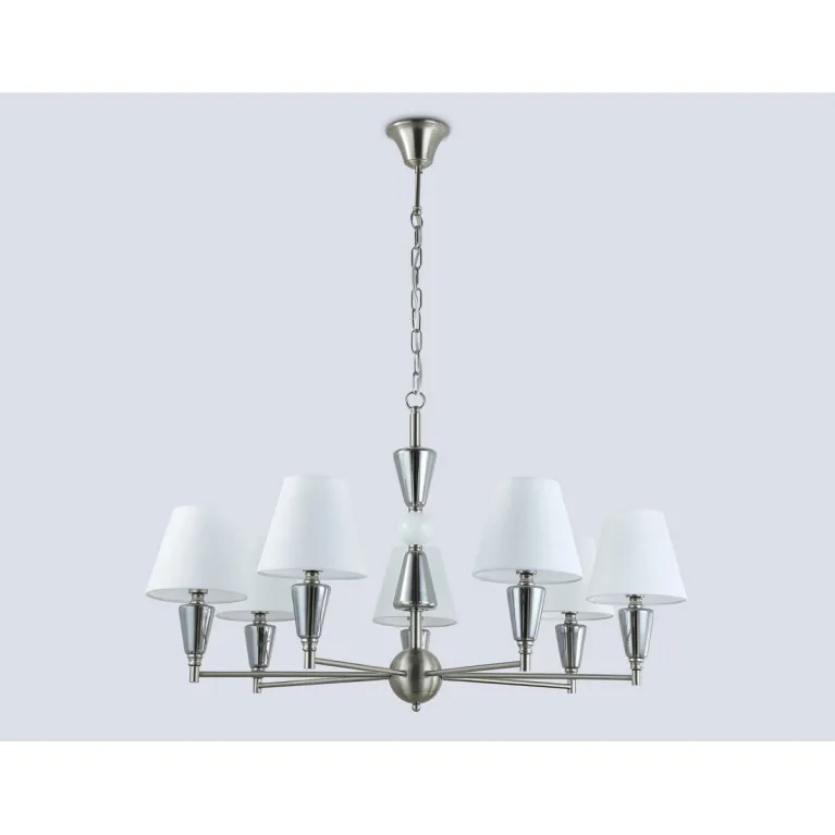 Преобладающий цвет плафонов: Белый, арматуры: Матовый никель; материал изготовления арматуры: Металл, размеры, мм: / высота 1210 / диаметр 860. Общая мощность – 280 Ватт, а максимальная площадь освещения до 23 м2. Основной тип ламп, предусмотренный производителем: Накаливания с цоколем E14. В зависимости от предпочтений можно использовать лампы теплового, холодного или нейтрального света, за исключением люстр с типом цоколя LED.