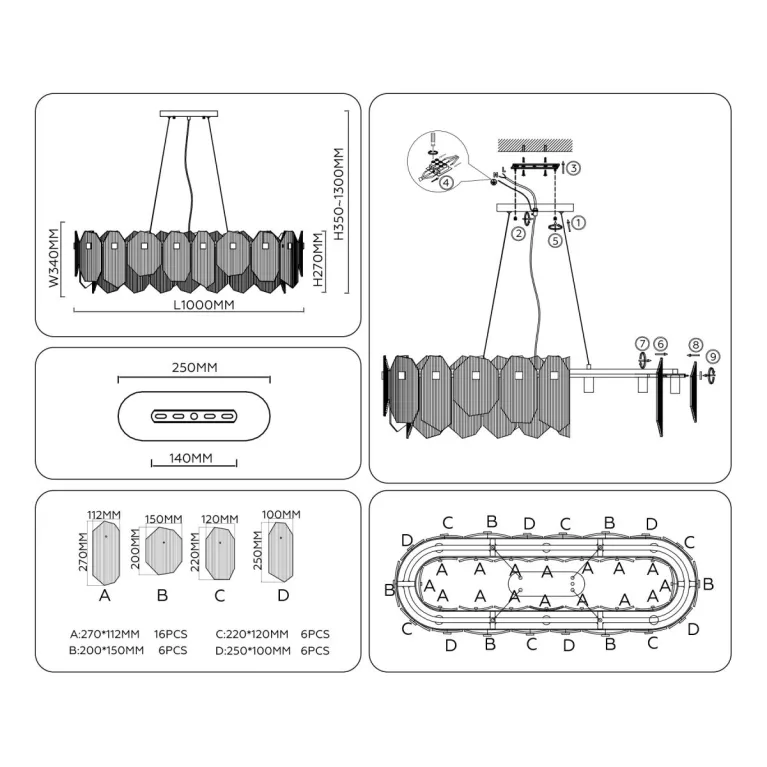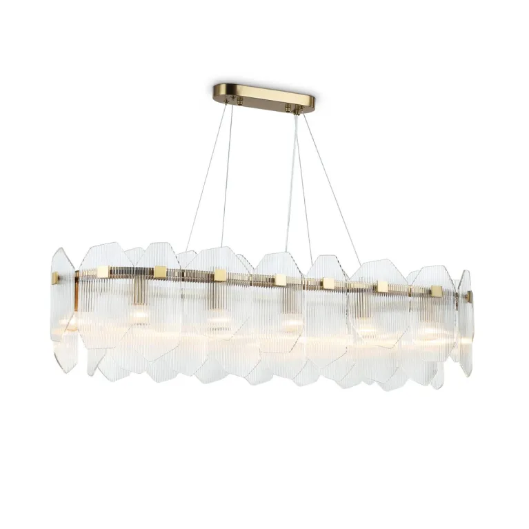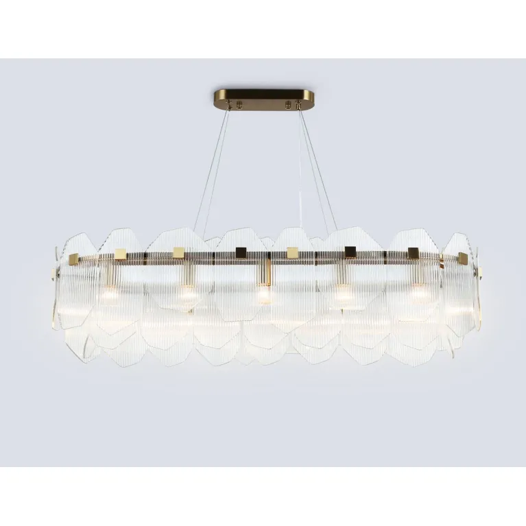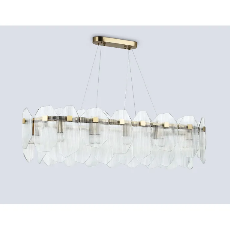Преобладающий цвет плафонов: Прозрачный, арматуры: Латунь; материал изготовления арматуры: Металл, размеры, мм: длина 1000 / ширина 340 / высота 1300 Общая мощность – 480 Ватт, а максимальная площадь освещения до 37 м2. Основной тип ламп, предусмотренный производителем: Накаливания с цоколем E14. В зависимости от предпочтений можно использовать лампы теплового, холодного или нейтрального света, за исключением люстр с типом цоколя LED.