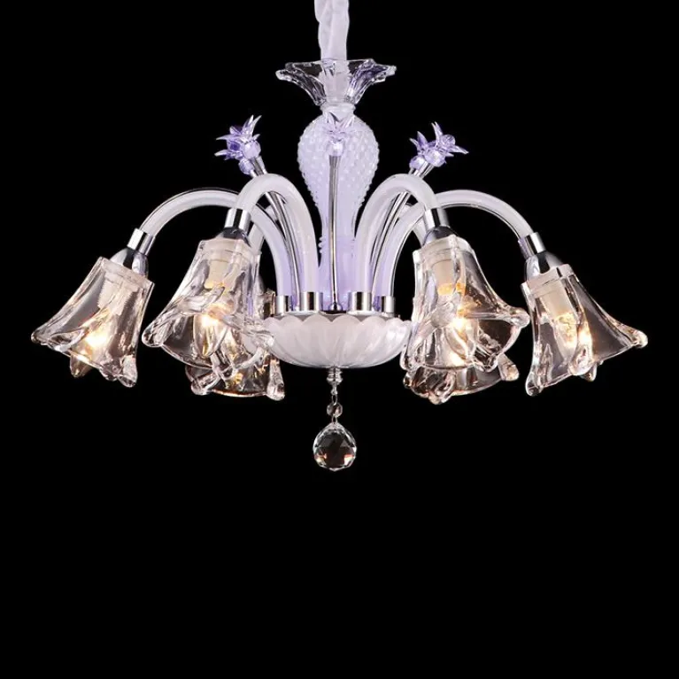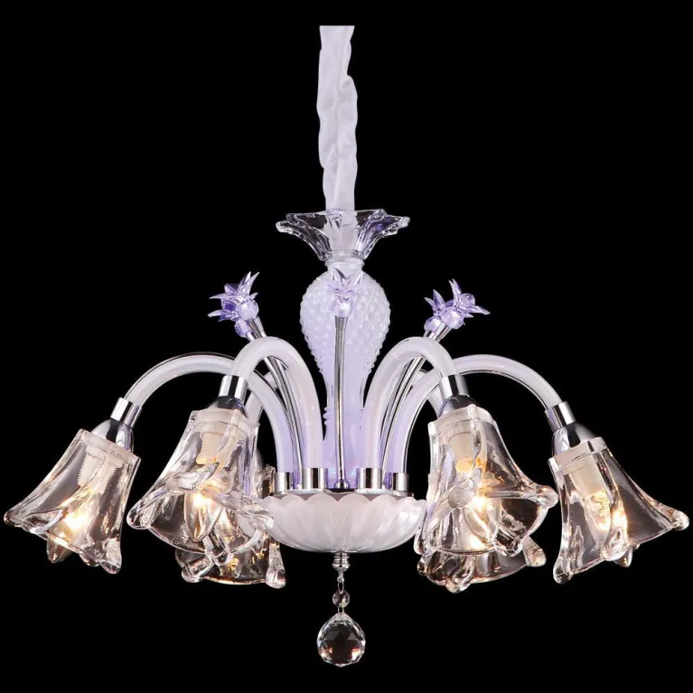 Преобладающий цвет люстры: Белый, плафонов: Прозрачный, арматуры: Хром; материал изготовления арматуры: Металл, размеры, мм: / высота 360 / диаметр 600. Общая мощность – 240 Ватт, а максимальная площадь освещения до 13,3 м2. Основной тип ламп, предусмотренный производителем: Накаливания с цоколем E14. В зависимости от предпочтений можно использовать лампы теплового, холодного или нейтрального света, за исключением люстр с типом цоколя LED.