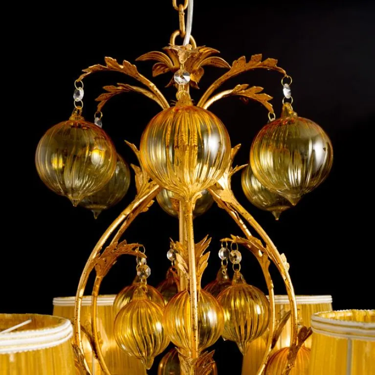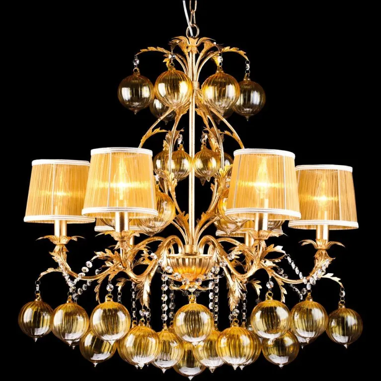 Люстра выполнена из высококачественного металла с золотым покрытием, что придаёт ей изысканный и дорогой вид. Плафоны изготовлены из прочного и долговечного стекла, благодаря чему светильник не только эстетически привлекателен, но и практичен в использовании.