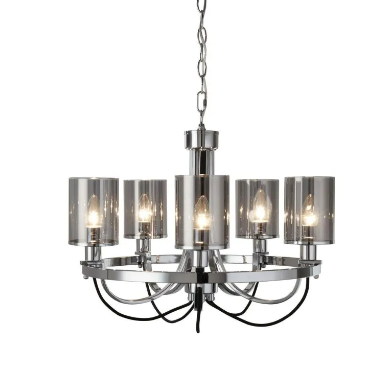 Люстра имеет пять ламп типа E27, что обеспечивает яркое и равномерное освещение пространства. Она выполнена в стильном хромированном корпусе и белых матовых абажурах, которые придают ей утонченный и современный вид. Основание светильника изготовлено из прочного металла, что гарантирует его долговечность и надежность.