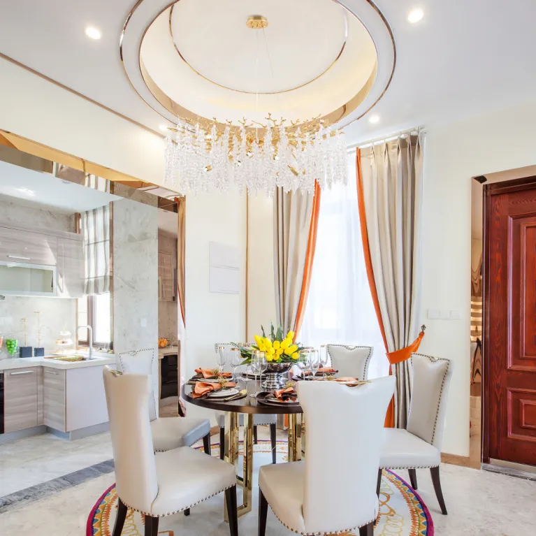 Люстра Arte Milano имеет оригинальный дизайн с изящными линиями и золотистыми элементами, которые придают ей роскошный вид. Она легко крепится к потолку и подходит для всех типов потолков, включая натяжные и подвесные.