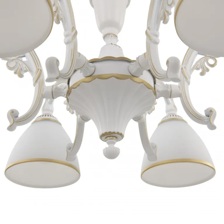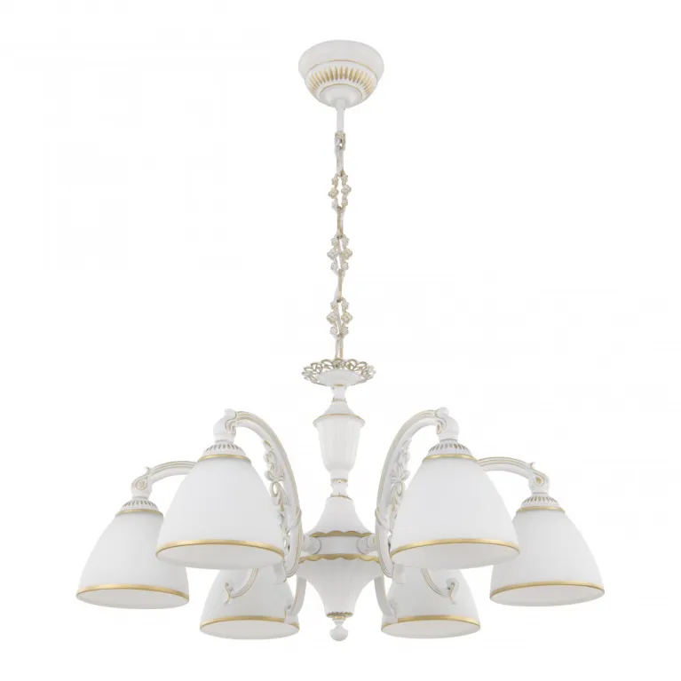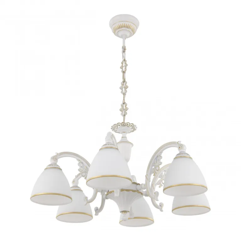 Люстра имеет шесть плафонов, которые направлены в разные стороны, обеспечивая равномерное освещение всего помещения. Цоколь E14 позволяет использовать различные типы ламп, включая светодиодные, что делает люстру более энергоэффективной и долговечной.