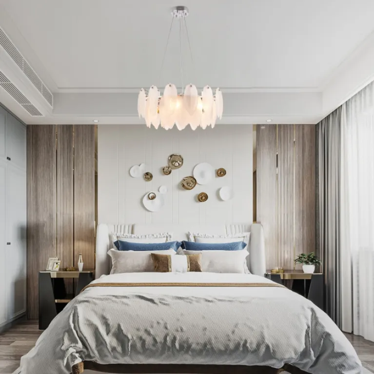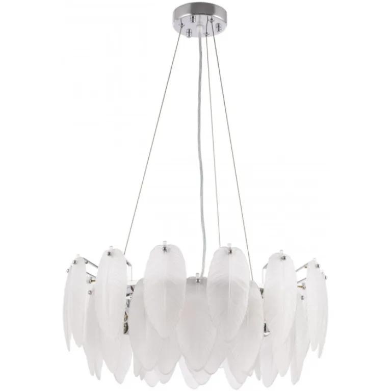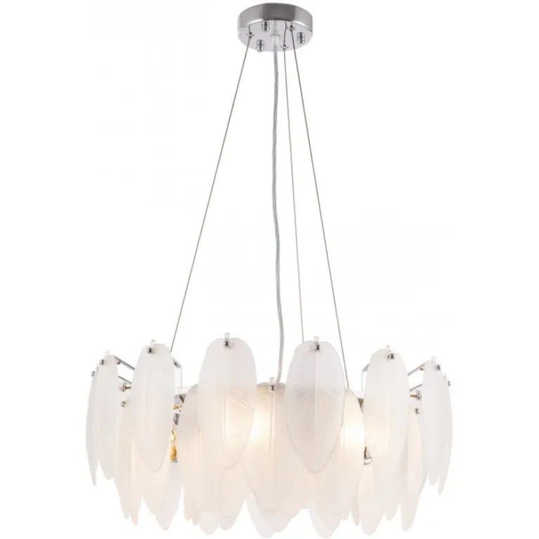 Преобладающий цвет плафонов: Белый, арматуры: Никель; материал изготовления арматуры: Металл, размеры, мм: длина 240 / высота 240 / диаметр 550. Общая мощность – 280 Ватт, а максимальная площадь освещения до 14 м2. Основной тип ламп, предусмотренный производителем: Накаливания с цоколем E14. В зависимости от предпочтений можно использовать лампы теплового, холодного или нейтрального света, за исключением люстр с типом цоколя LED.