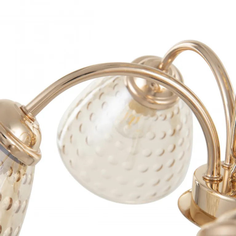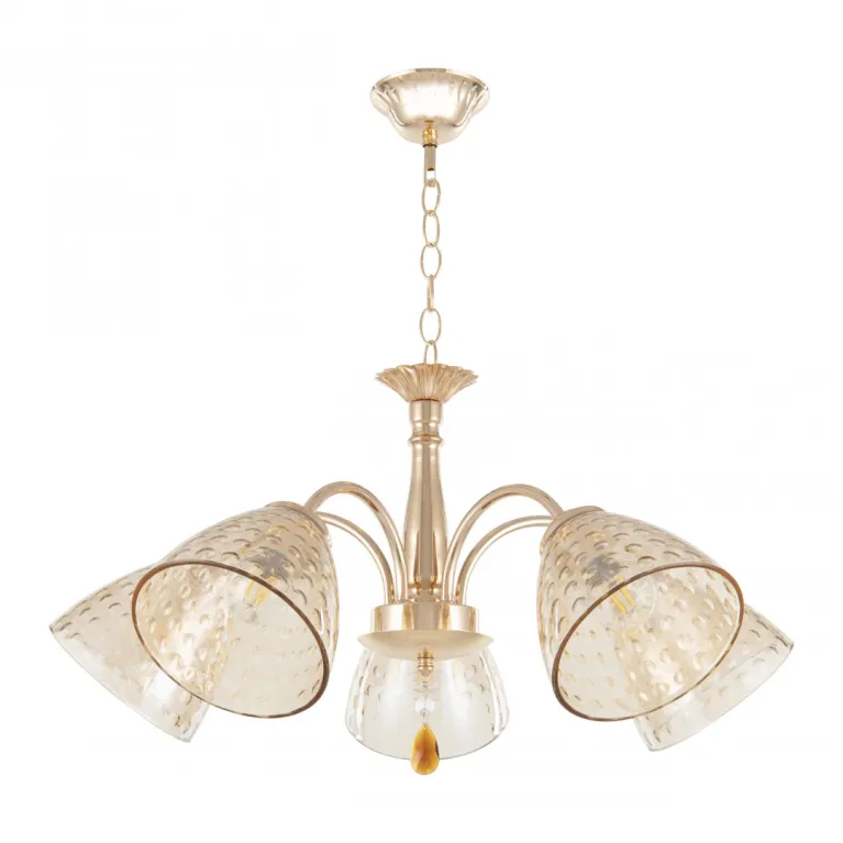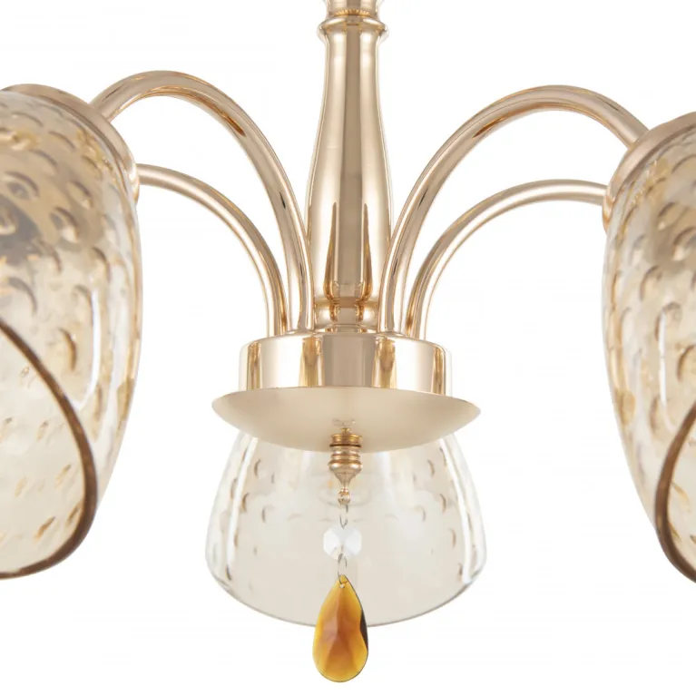 Преобладающий цвет плафонов: Янтарный, арматуры: Золото; материал изготовления арматуры: Металл, размеры, мм: длина 300 / высота 300 / диаметр 600. Общая мощность – 200 Ватт. Основной тип ламп, предусмотренный производителем: Накаливания с цоколем E27. В зависимости от предпочтений можно использовать лампы теплового, холодного или нейтрального света, за исключением люстр с типом цоколя LED.