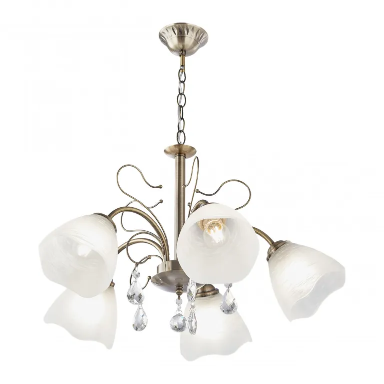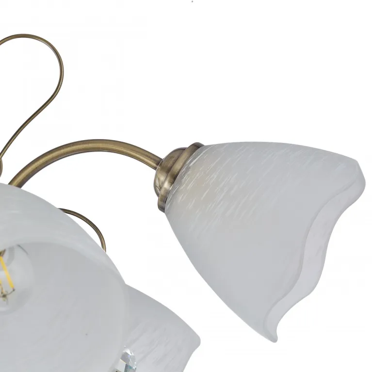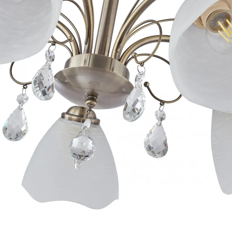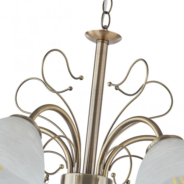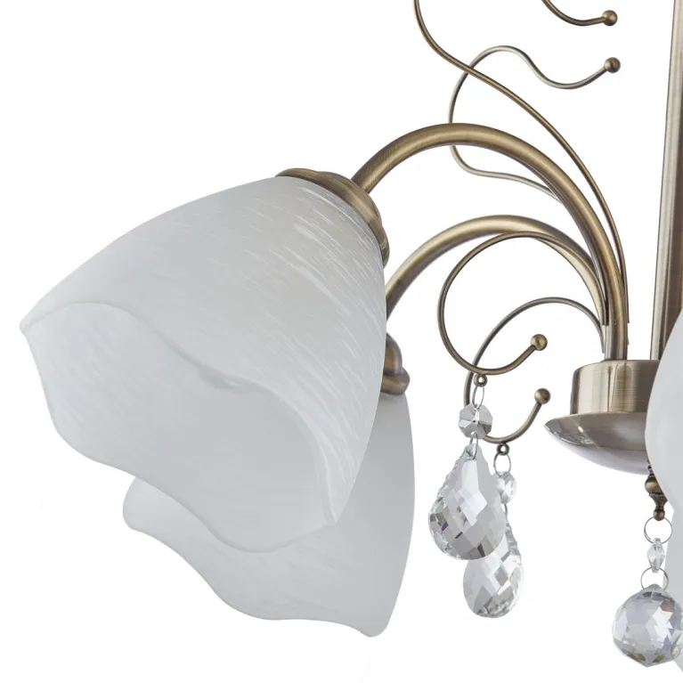 Преобладающий цвет плафонов: Белый, арматуры: Бронза; материал изготовления арматуры: Металл, размеры, мм: длина 350 / высота 350 / диаметр 600. Общая мощность – 200 Ватт. Основной тип ламп, предусмотренный производителем: Накаливания с цоколем E27. В зависимости от предпочтений можно использовать лампы теплового, холодного или нейтрального света, за исключением люстр с типом цоколя LED.