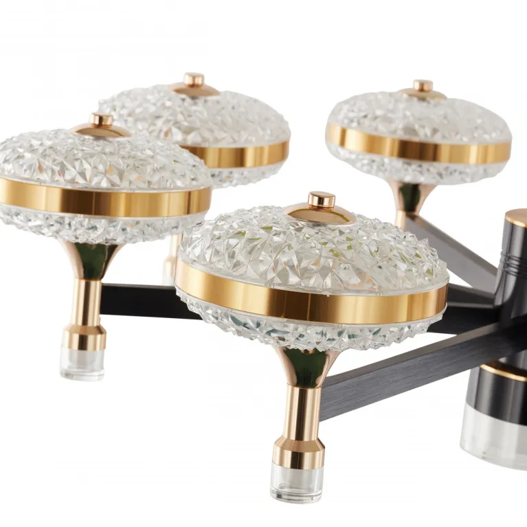 Преобладающий цвет плафонов: Прозрачный, арматуры: Черный; материал изготовления арматуры: Металл, размеры, мм: длина 360 / высота 360 / диаметр 850. Общая мощность – 128 Ватт. Основной тип ламп, предусмотренный производителем: Светодиодная с цоколем LED. В зависимости от предпочтений можно использовать лампы теплового, холодного или нейтрального света, за исключением люстр с типом цоколя LED.