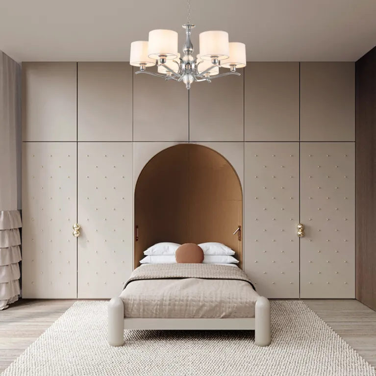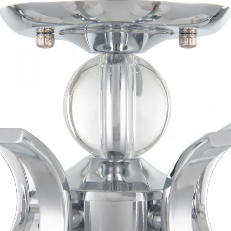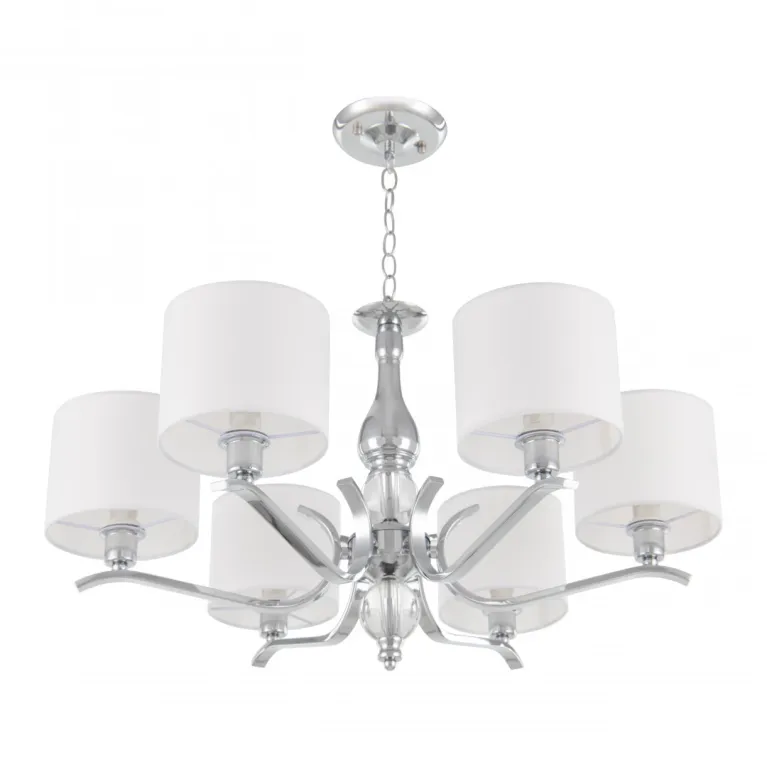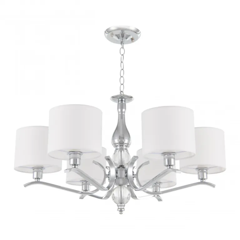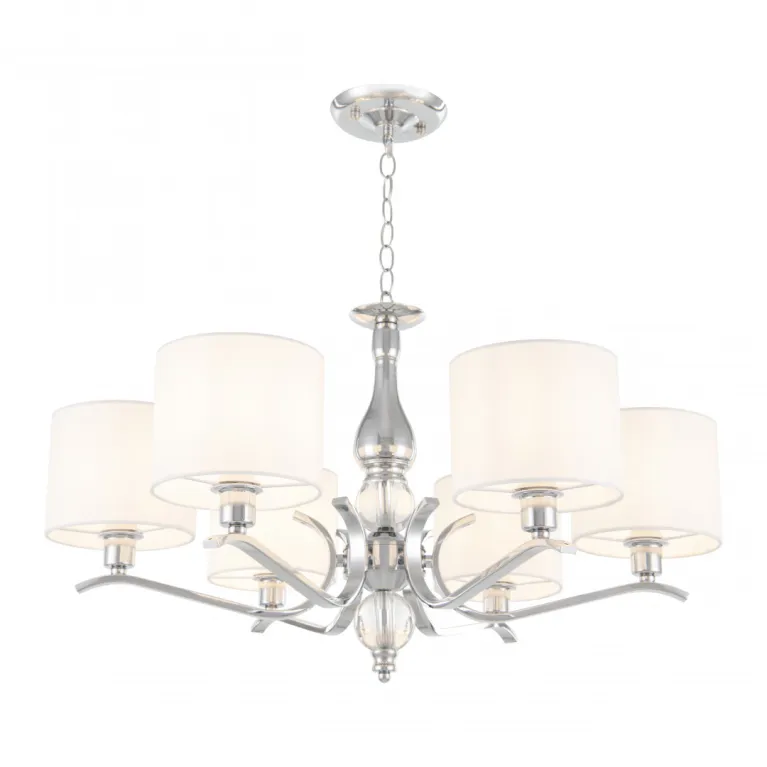 Преобладающий цвет плафонов: Белый, арматуры: Хром; материал изготовления арматуры: Металл, размеры, мм: длина 370 / высота 370 / диаметр 640. Общая мощность – 240 Ватт. Основной тип ламп, предусмотренный производителем: Накаливания с цоколем E14. В зависимости от предпочтений можно использовать лампы теплового, холодного или нейтрального света, за исключением люстр с типом цоколя LED.