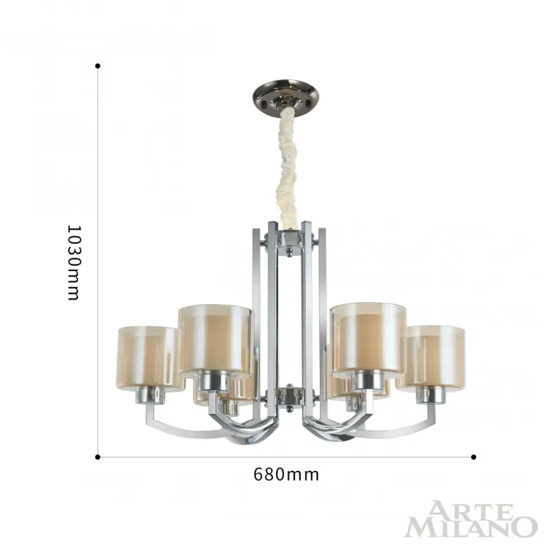 Преобладающий цвет плафонов: Прозрачный, арматуры: Никель; материал изготовления арматуры: Металл, размеры, мм: длина 430 / высота 430 / диаметр 680. Общая мощность – 240 Ватт. Основной тип ламп, предусмотренный производителем: Накаливания с цоколем E27. В зависимости от предпочтений можно использовать лампы теплового, холодного или нейтрального света, за исключением люстр с типом цоколя LED.